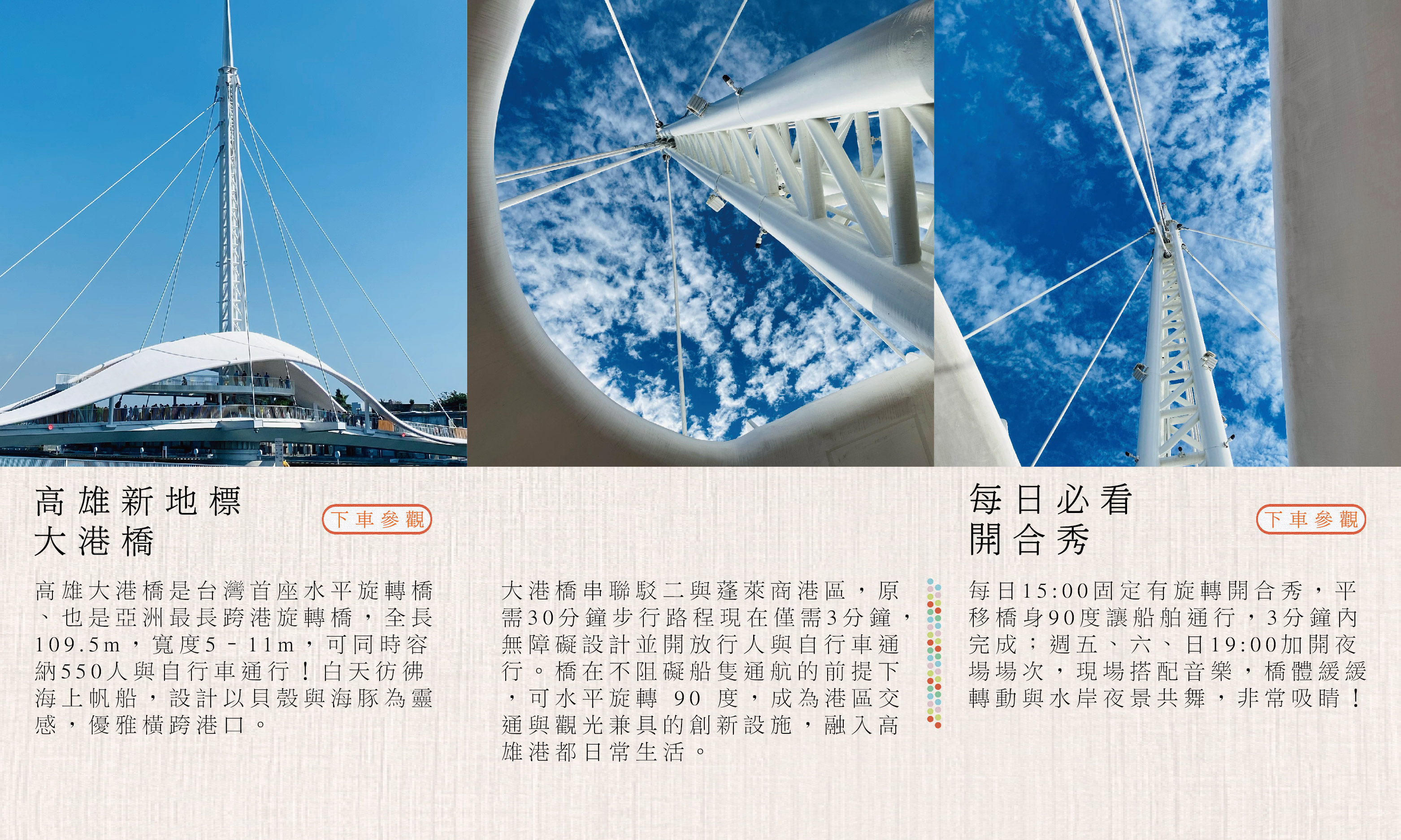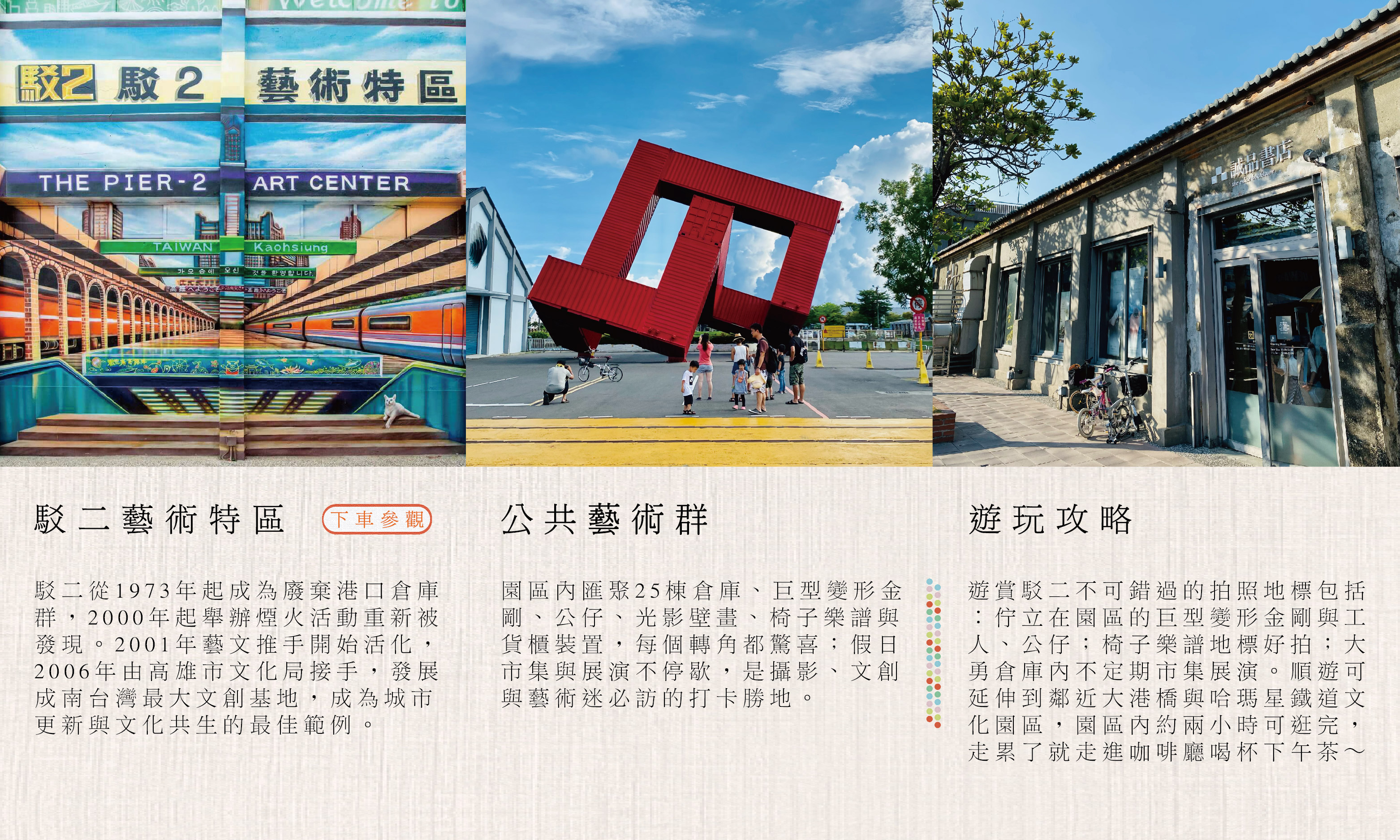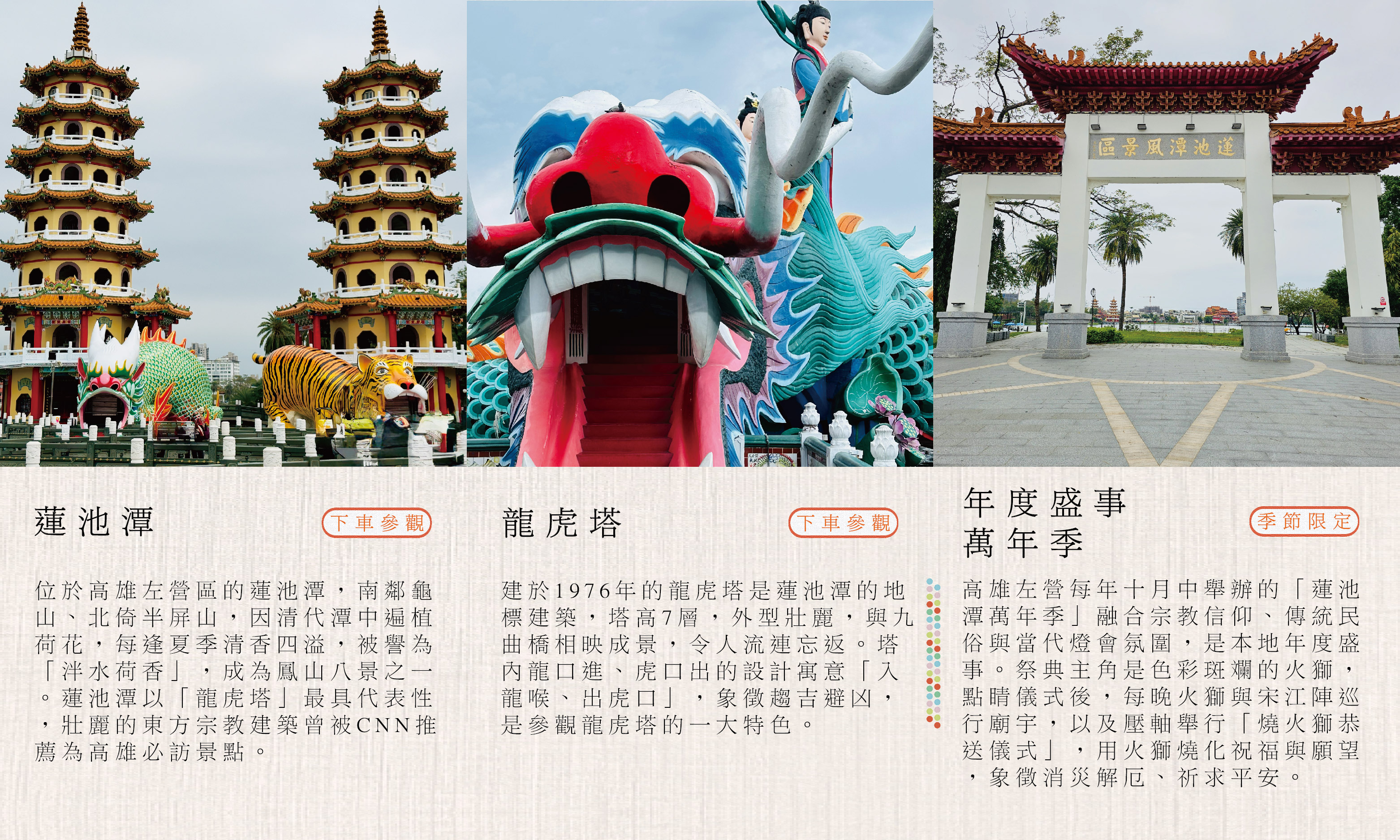 在高雄的蓮池潭龍虎塔和鳳儀書院探索古蹟文化,品味可可米果的眷村家鄉風味,漫步駁二藝術特區的文創海港和衛武營的世界級藝術中心.全程由賓士專車到府接送,讓您品味港都深度的文化藝術旅行的美好 .ᐟ.ᐟ.ᐟ( 若遇未開團日期請洽業務,另有散拚團,4人成行 )