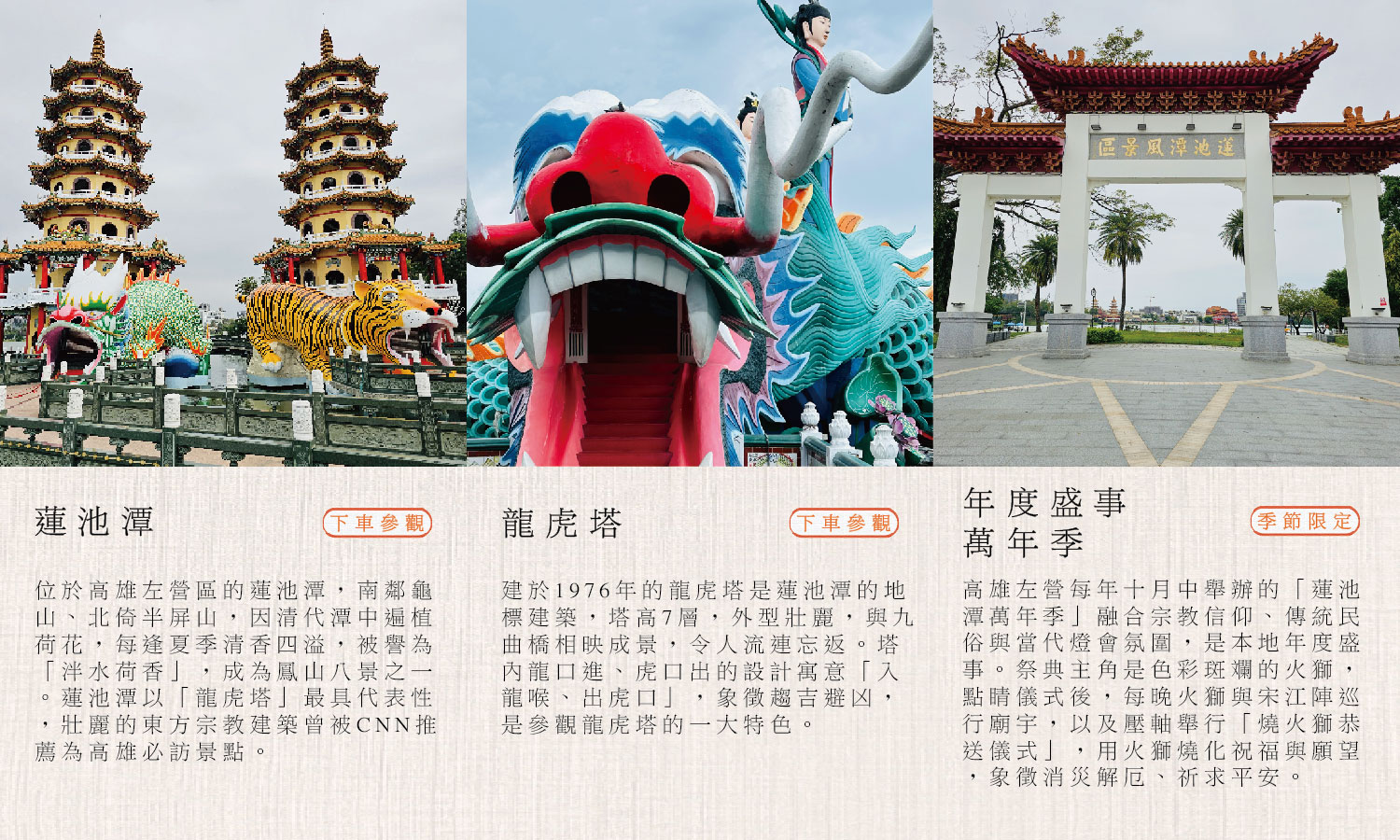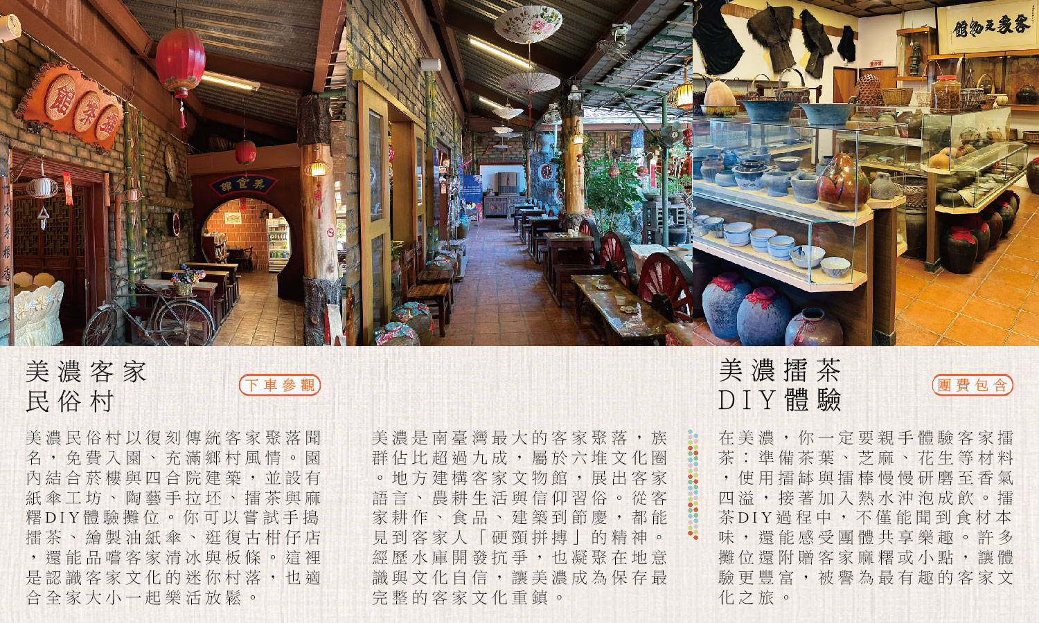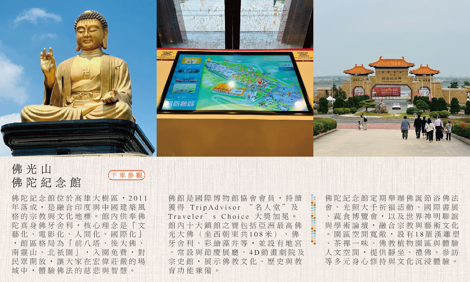 第一天 𝐹𝑖𝑟𝑠𝑡 𝐷𝑎𝑦啟程 ⟡ 新左營高鐵站集合( 09:00 ) ⇀ 心靈巡禮 ♡ 佛光山佛陀紀念館〖亞洲最大佛教文化地標〗 ⇀ 老街午食 ♡ 旗山老街〖香蕉產地、懷舊老店、復古街景〗 ⇀ ✩ 特別贈送客家擂茶 DIY 體驗 ♡ 美濃民俗村〖紙傘工藝、客家風情〗 ⇀ 地景奇觀 ♡ 烏山頂泥火山〖台灣少見的泥火山景觀〗 ⇀ ✩ 蓮池潭・龍虎塔〖走虎入龍、祈福納祥〗 ⇀ 復歸 ♡ 新左營高鐵站(17:00)