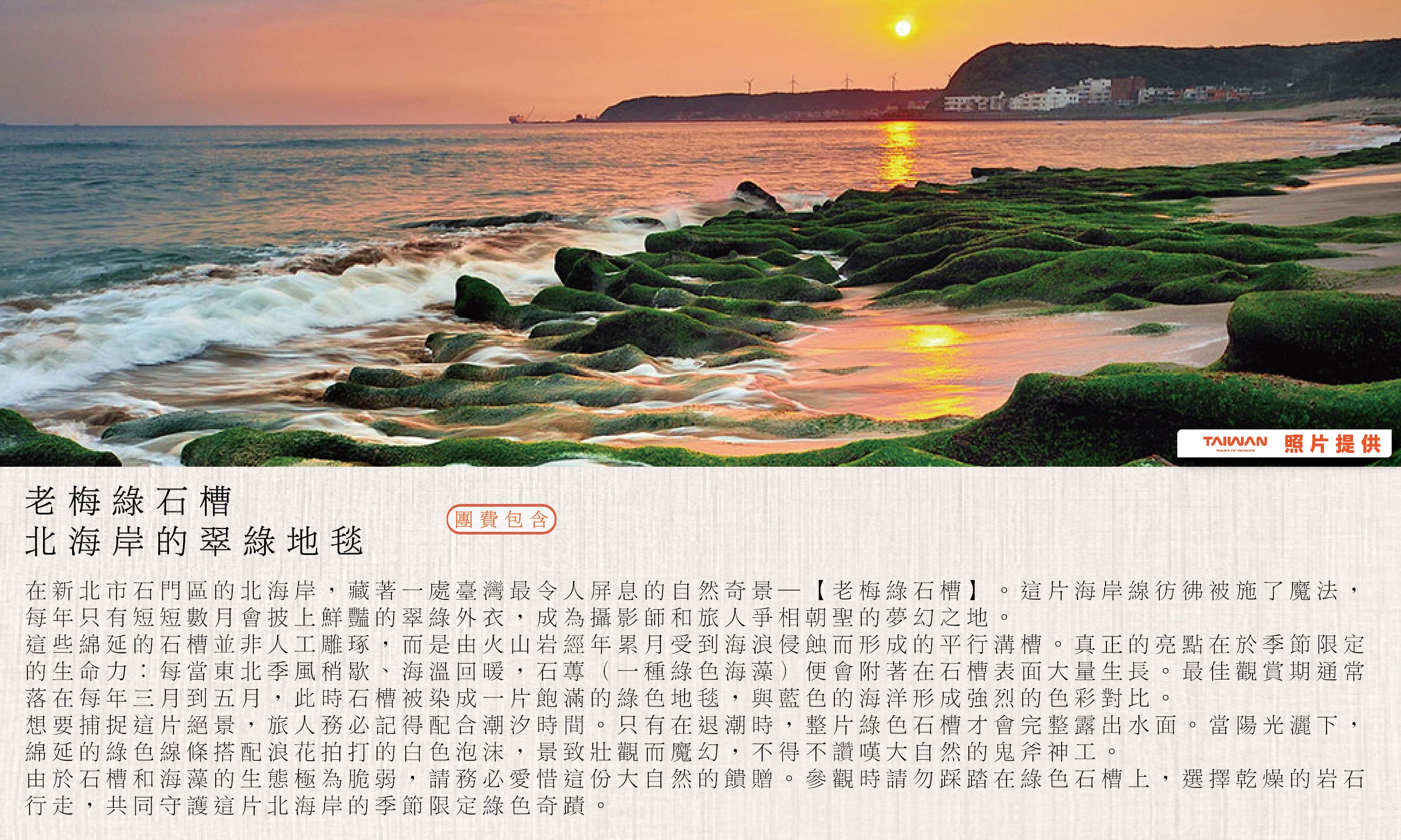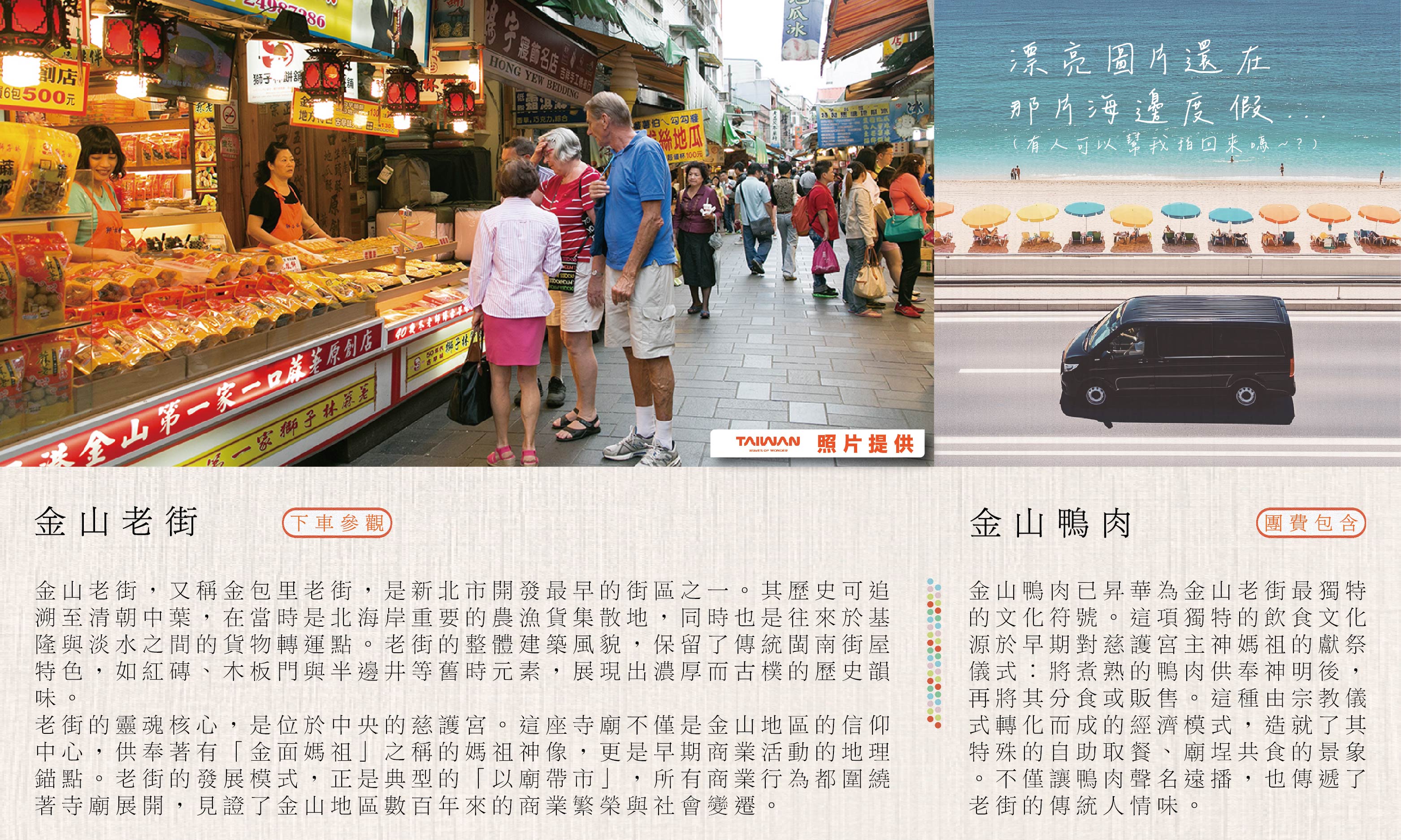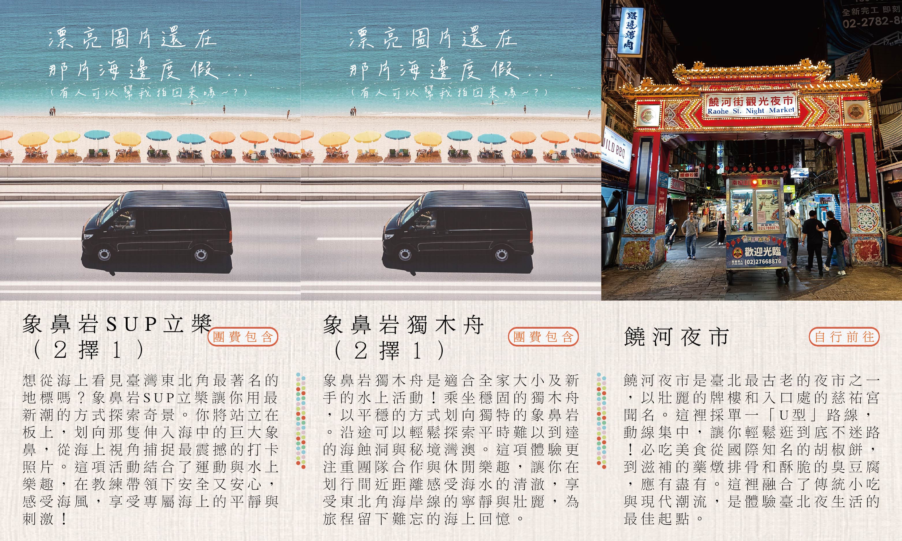 在新北的金山溫泉和野柳地質公園享受海風療癒,品味基隆廟口夜市與饒河夜市的在地美食,沉浸於九份老街的山城和迪化街的百年風情.全程由賓士專車到府接送,讓您品味北北基山海旅行的美好.天天出發。( 若遇未開團日期請洽業務,另有散拚團,6人成行 )