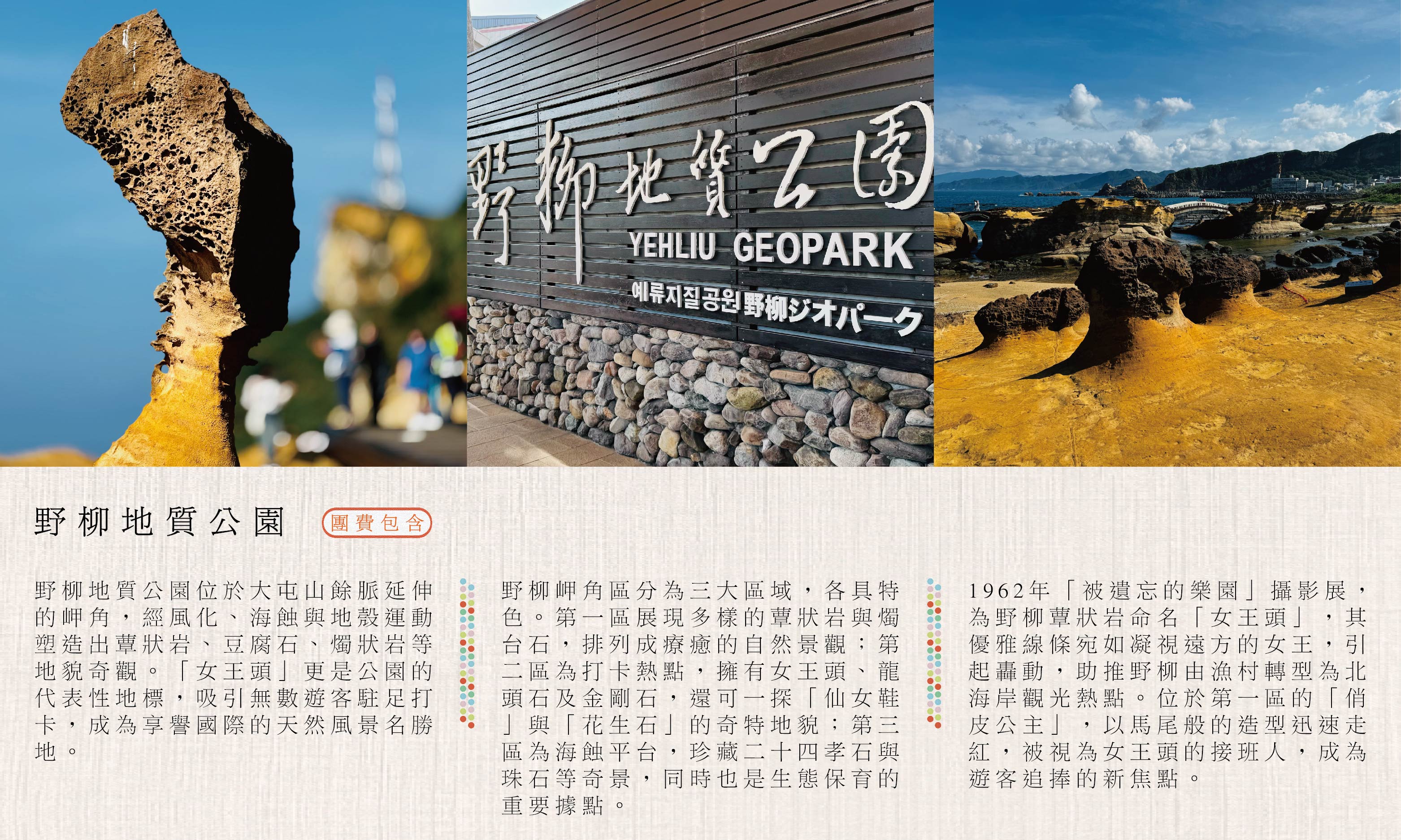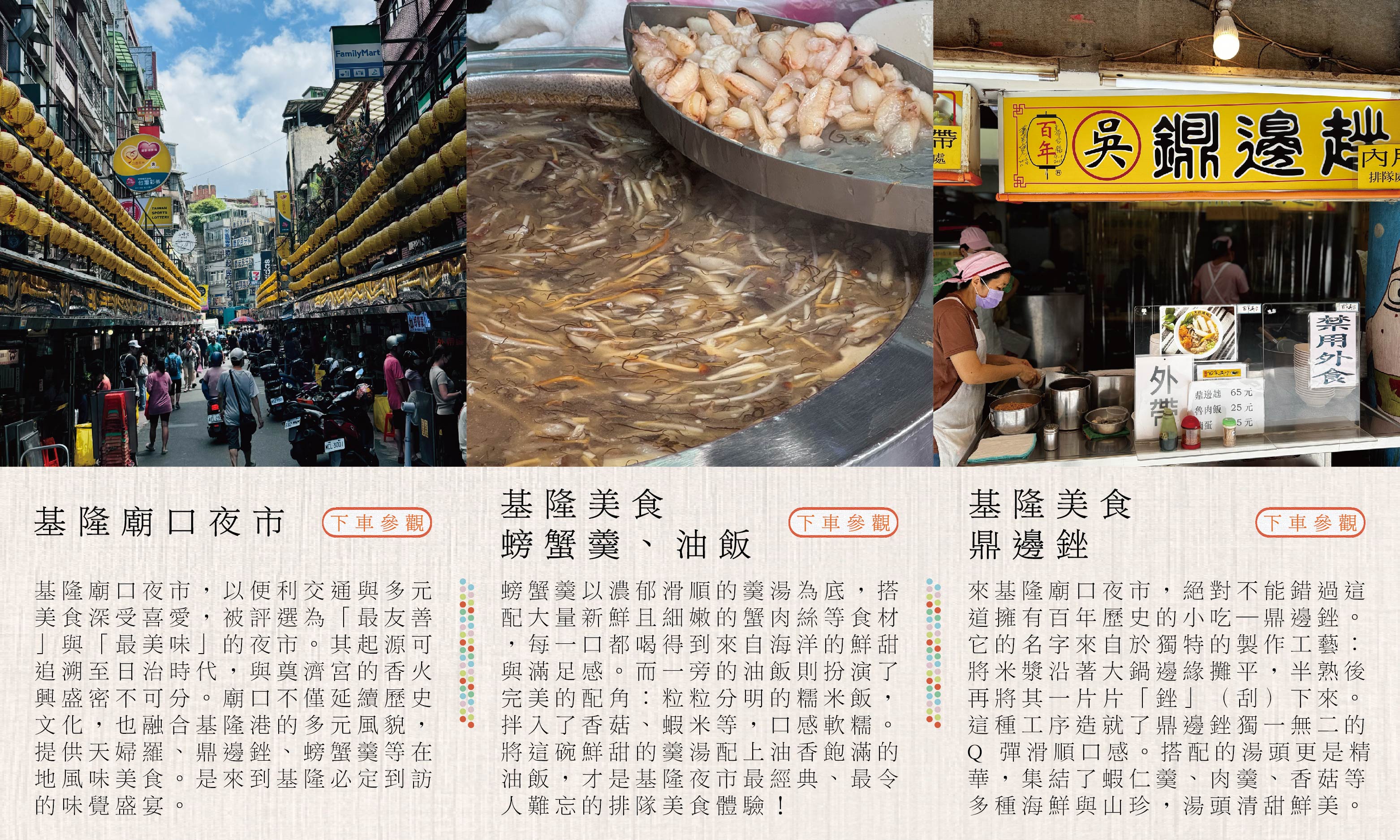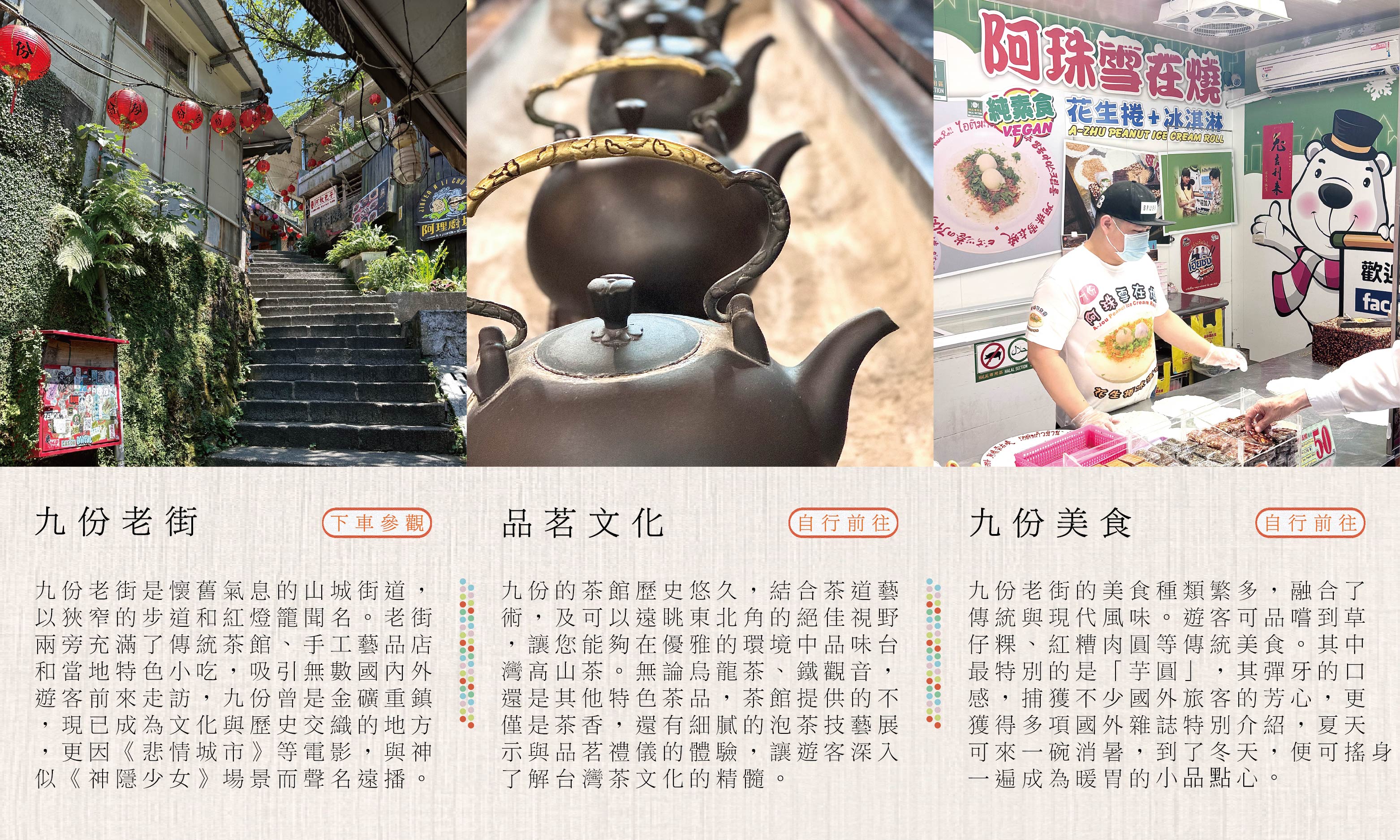 在新北的金山溫泉和野柳地質公園享受海風療癒,品味基隆廟口夜市與饒河夜市的在地美食,沉浸於九份老街的山城和迪化街的百年風情.全程由賓士專車到府接送,讓您品味北北基山海旅行的美好.天天出發。( 若遇未開團日期請洽業務,另有散拚團,6人成行 )