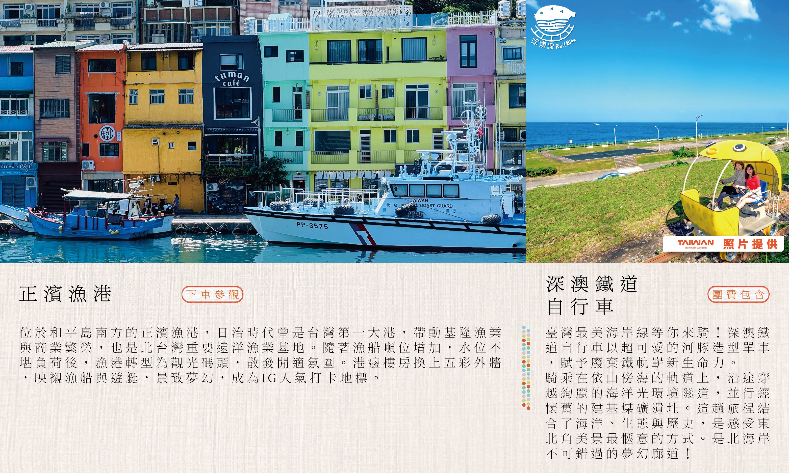 第二天 𝑆𝑒𝑐𝑜𝑛𝑑 𝐷𝑎𝑦啟程 ⟡ 基隆長榮桂冠酒店 ⇀ 彩色小屋 ♡ 正濱漁港〖IG 打卡熱點〗⇀ 鐵道樂趣 ♡ 深澳鐵道自行車(河豚單車)〖沿海自行車道・親子同樂〗⇀ ✩ 山城魅力 ♡ 九份老街〖茶藝文化・小吃散策〗⇀ 海上體驗 ♡ 象鼻岩 SUP 立槳/獨木舟 ⇀ 夜市巡禮 ♡ 饒河夜市〖台北人氣夜市〗⇀ 夜宿 ⟡ 基隆長榮桂冠酒店
