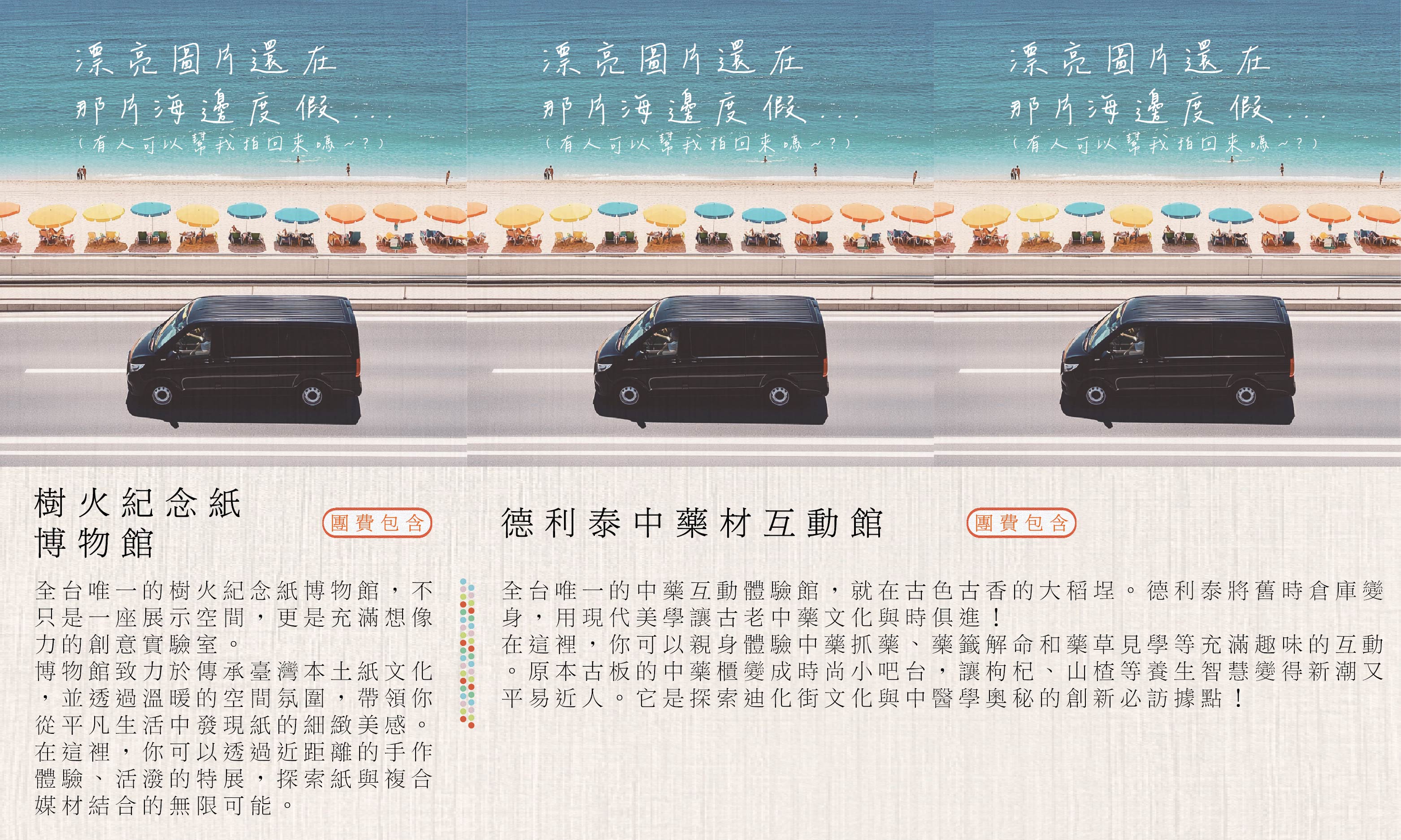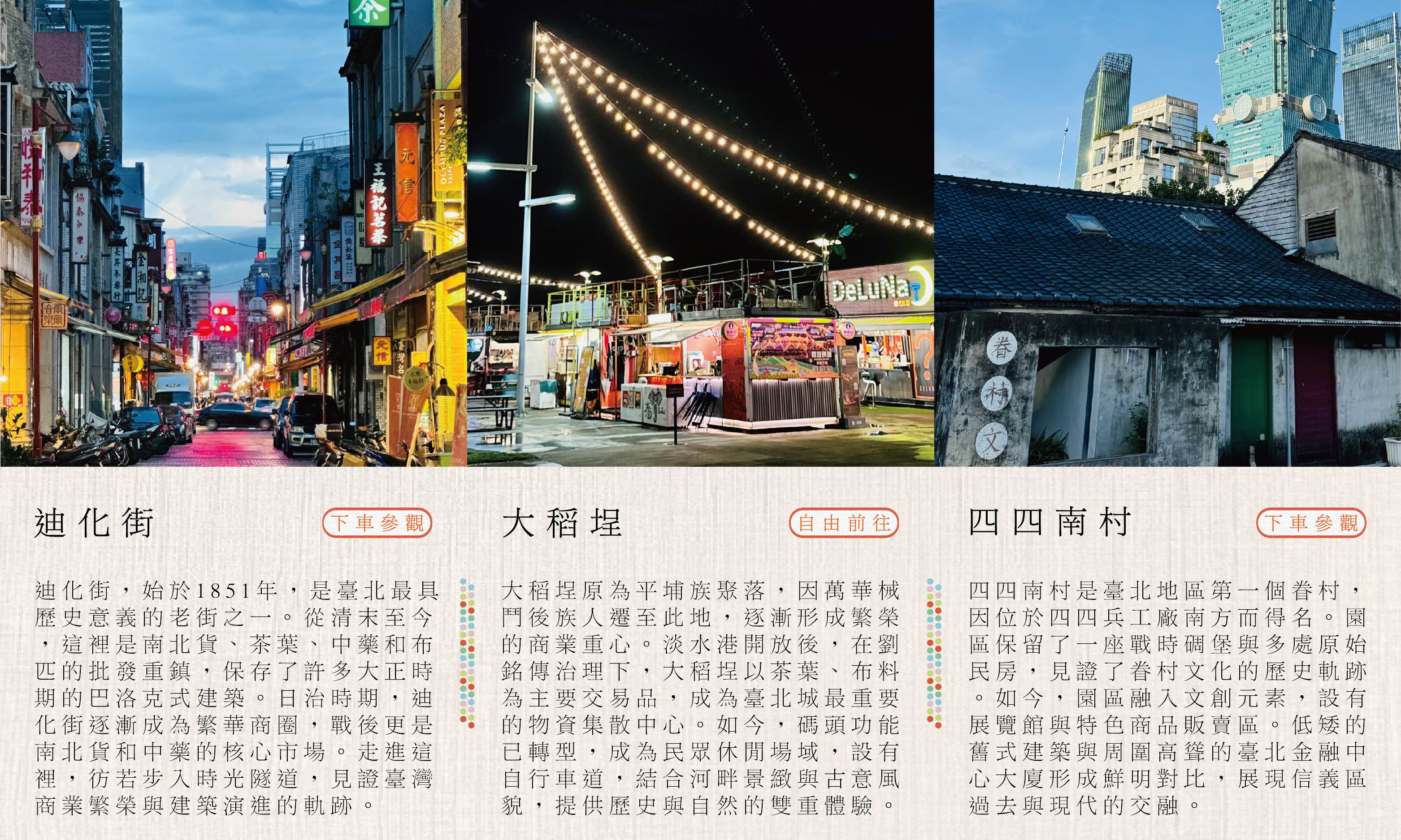 第三天 𝑇ℎ𝑖𝑟𝑑 𝑑𝑎𝑦啟程 ⟡ 基隆長榮桂冠酒店 ⇀ 樹火紀念紙博物館〖紙藝工坊・親手體驗傳統造紙〗⇀ 德利泰中藥材互動館〖中藥文化・互動導覽體驗〗⇀ 迪化街〖百年商行・文青小店・乾貨伴手禮〗⇀ 四四南村〖眷村改造・文創聚落〗⇀ 淡水老街 × 漁人碼頭〖夕陽美景・小吃散步・情人橋夜景〗⇀ 復歸 ⟡ 溫暖的家 / 台北車站