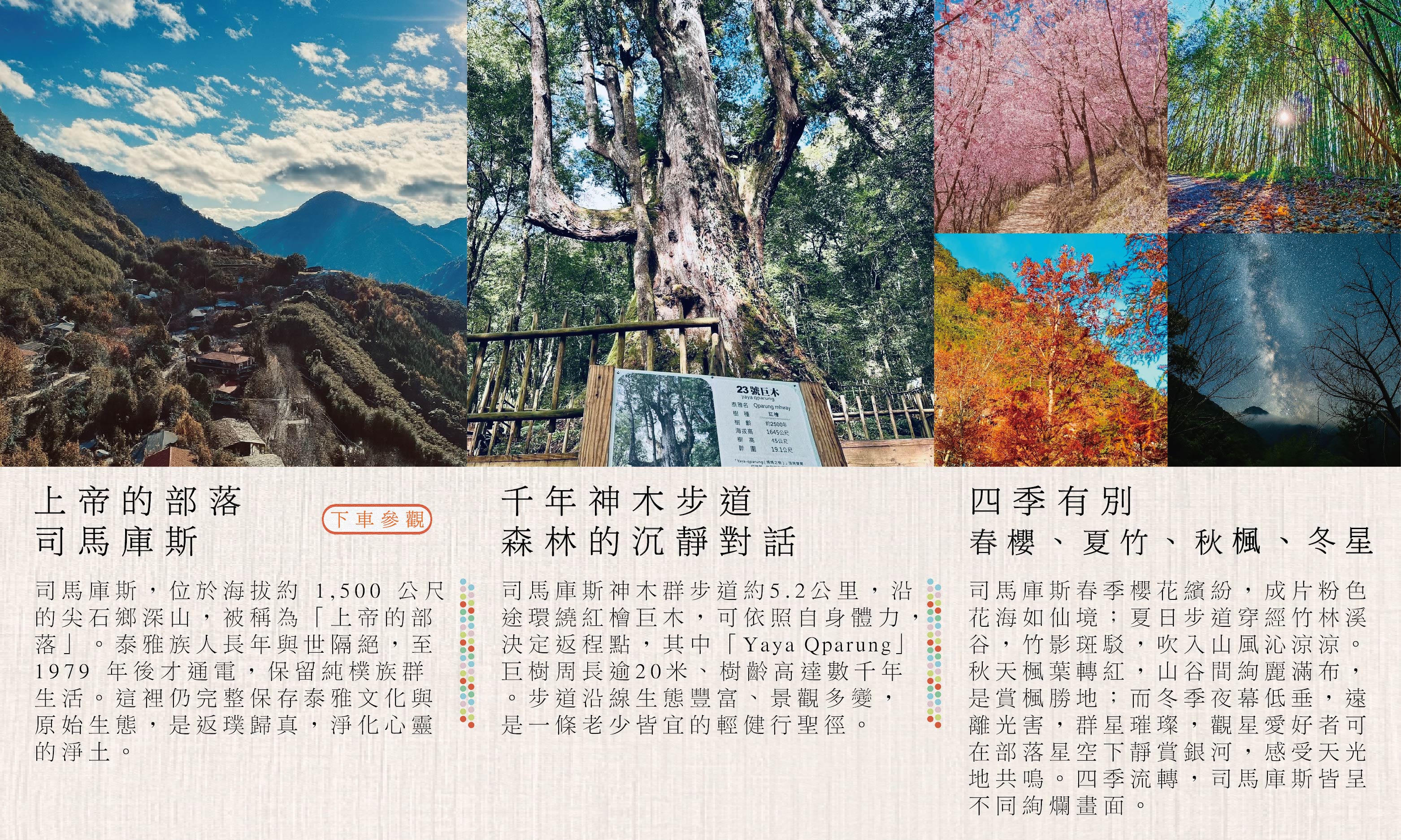 第一天 𝐹𝑖𝑟𝑠𝑡 𝐷𝑎𝑦啟程 ⟡ 新竹高鐵車站(08:30) ⇀ 山城漫步 ♡ 內灣老街〖老街美食・客家風味〗 ⇀ ✩ 巨木之旅 ♡ 司馬庫斯巨木群步道〖泰雅秘境・深山森林體驗〗 ⇀ 夜宿部落