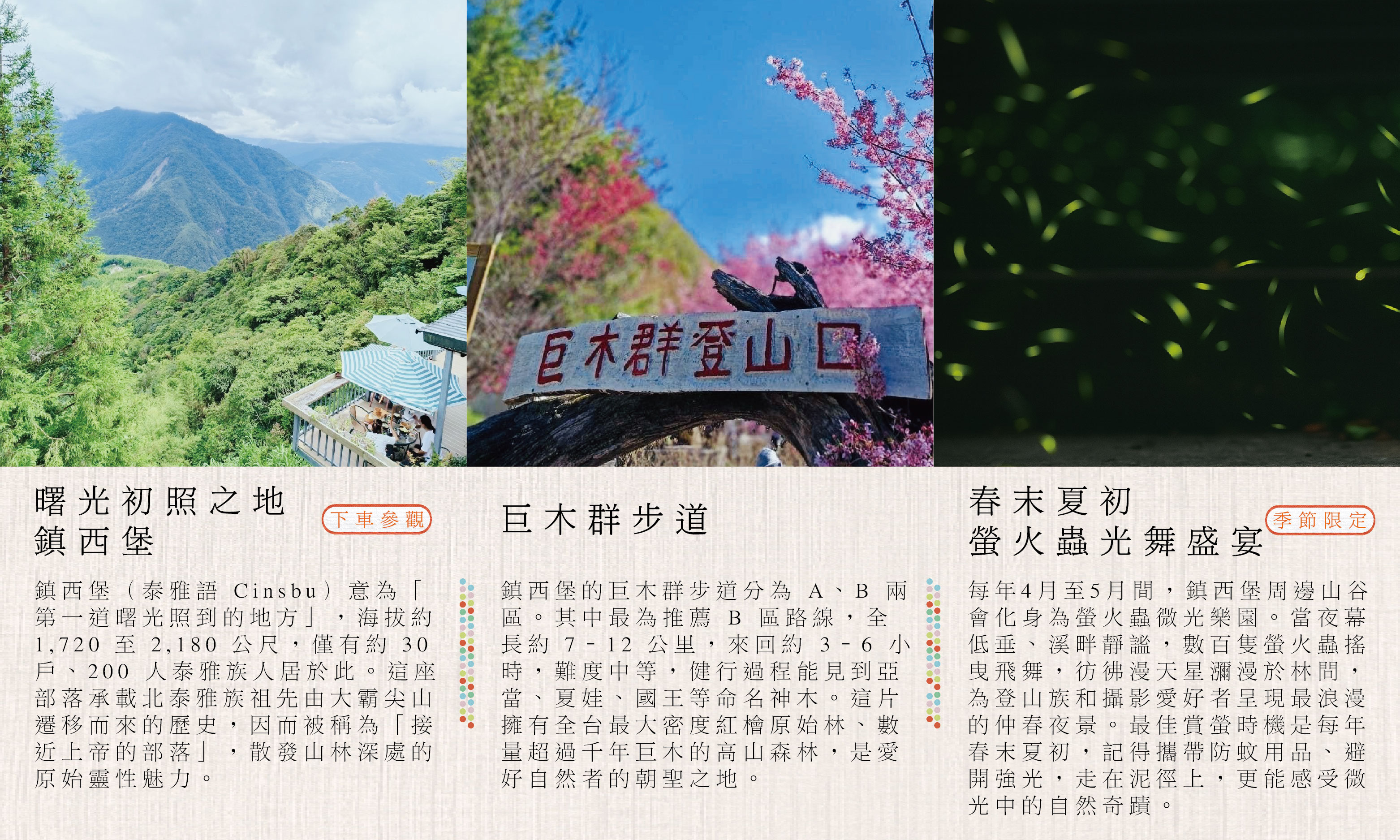 在新竹的司馬庫斯與鎮西堡尋訪泰雅秘境巨木,品味內灣老街客家小吃與峰巒棧山產美食,享受杉沐松農場的部落體驗和新光國小的純樸風情.全程由賓士專車到府接送,讓您品味上帝部落的森林奇景旅行的美好 .ᐟ.ᐟ.ᐟ( 若遇未開團日期請洽業務,另有散拚團,6人成行 )