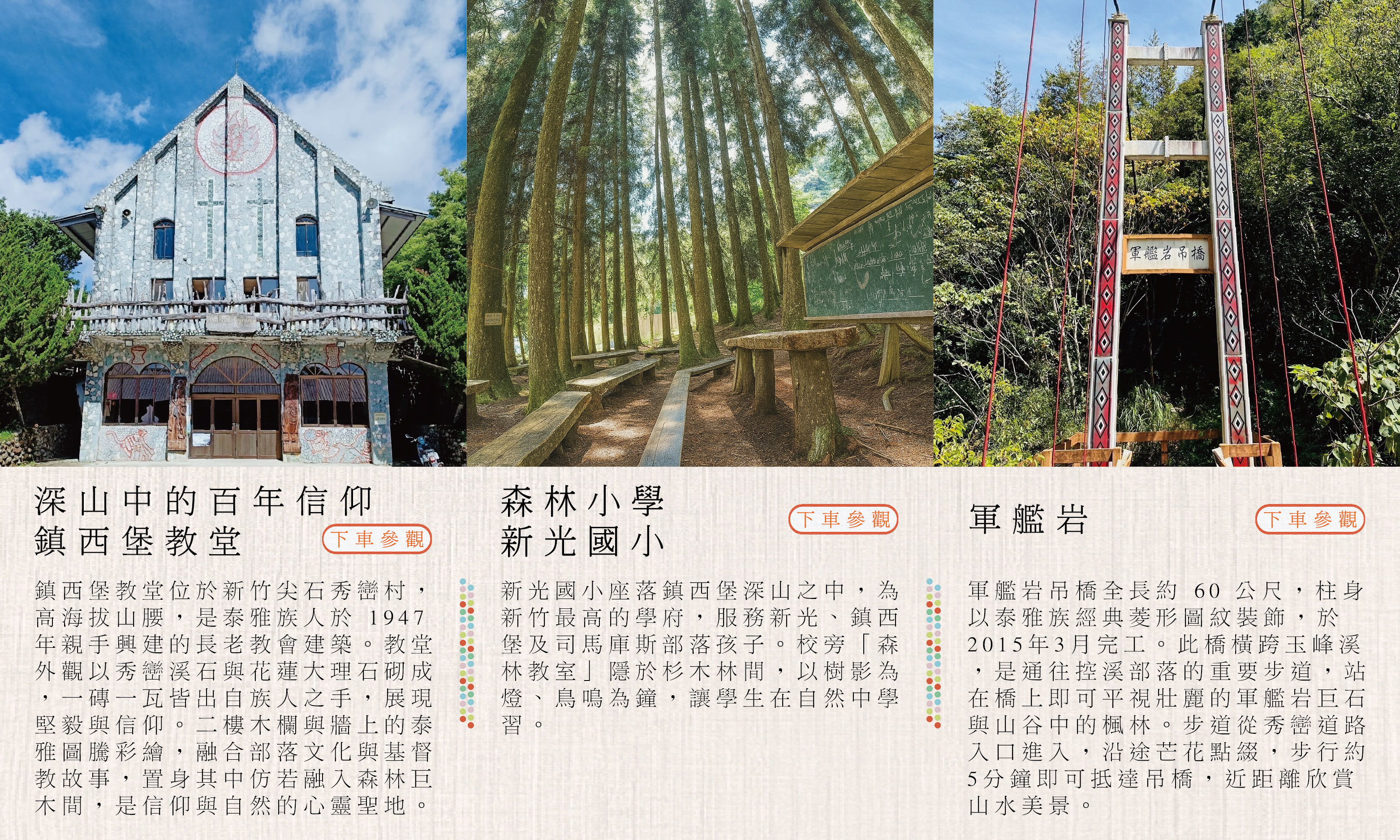 第三天 𝑇ℎ𝑖𝑟𝑑 𝑑𝑎𝑦啟程 ⟡ 部落晨食 ⇀ 山中百年信仰 ♡ 鎮西堡教堂 ⇀ 新光國小〖森林小學〗 ⇀ 軍艦岩 ⇀ 午食饗宴 ♡ 峰巒棧午餐〖在地山產・景觀餐廳〗⇀ ✩ 原民體驗 ♡ 杉沐松農場 ⇀ 復歸 ⟡ 新竹高鐵車站