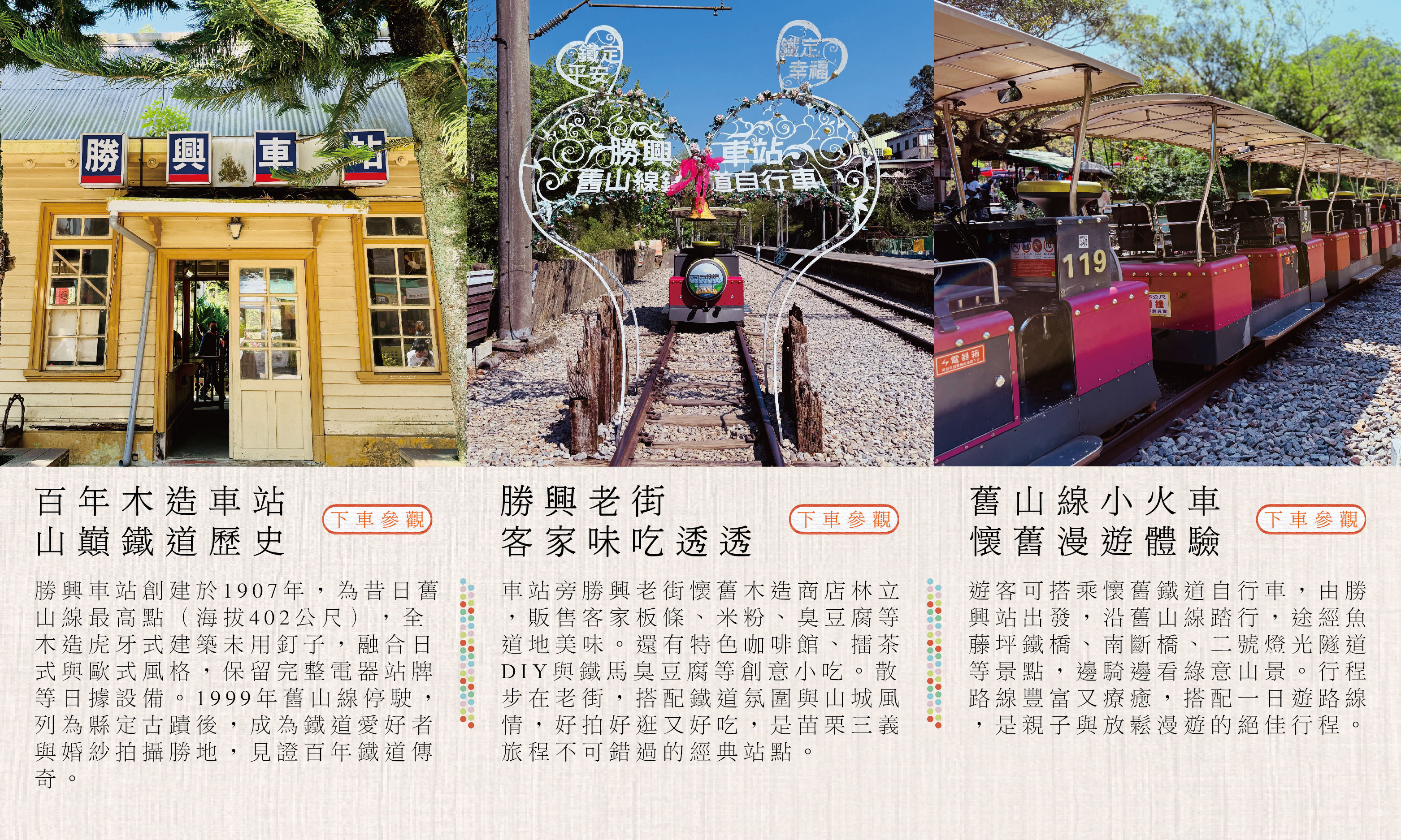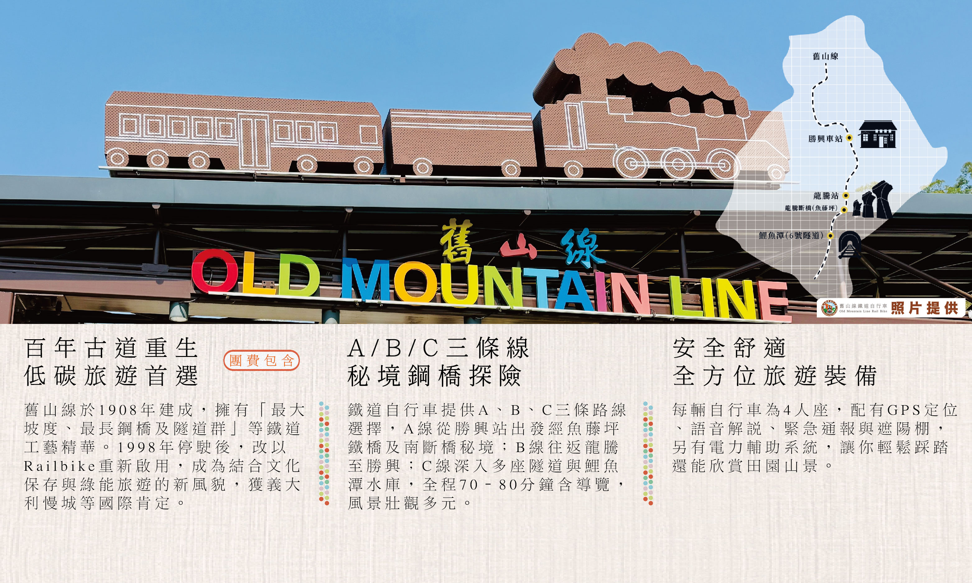 在苗栗的飛牛牧場享受親子趣味,體驗舊山線鐵道自行車與動物互動,品味勝興客棧的在地客家美食,沉浸於龍騰斷橋的歷史風情與勝興車站的懷舊鐵道.全程由賓士專車到府接送,讓您品味苗栗山城的親子輕旅行的美好 .ᐟ.ᐟ.ᐟ( 若遇未開團日期請洽業務,另有散拚團,6人成行 )