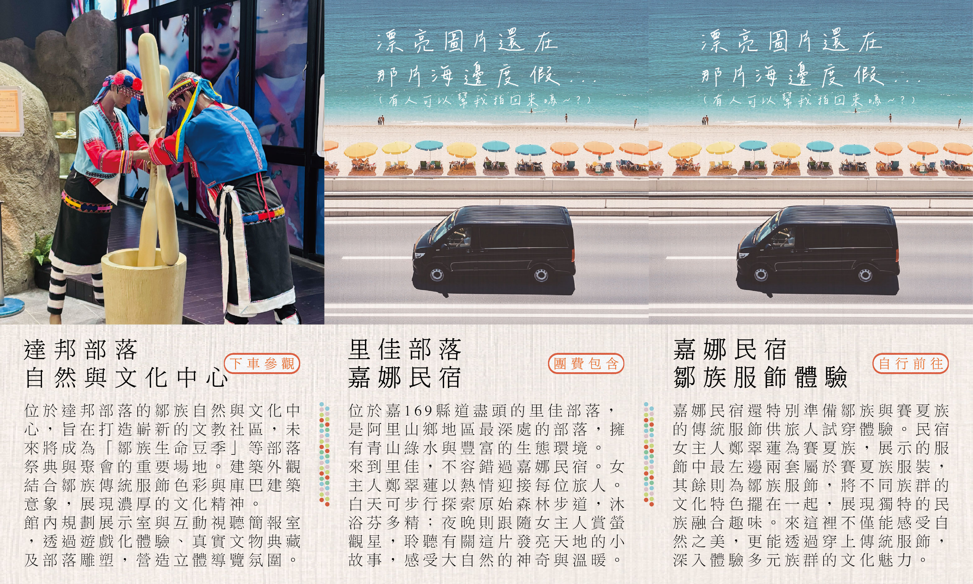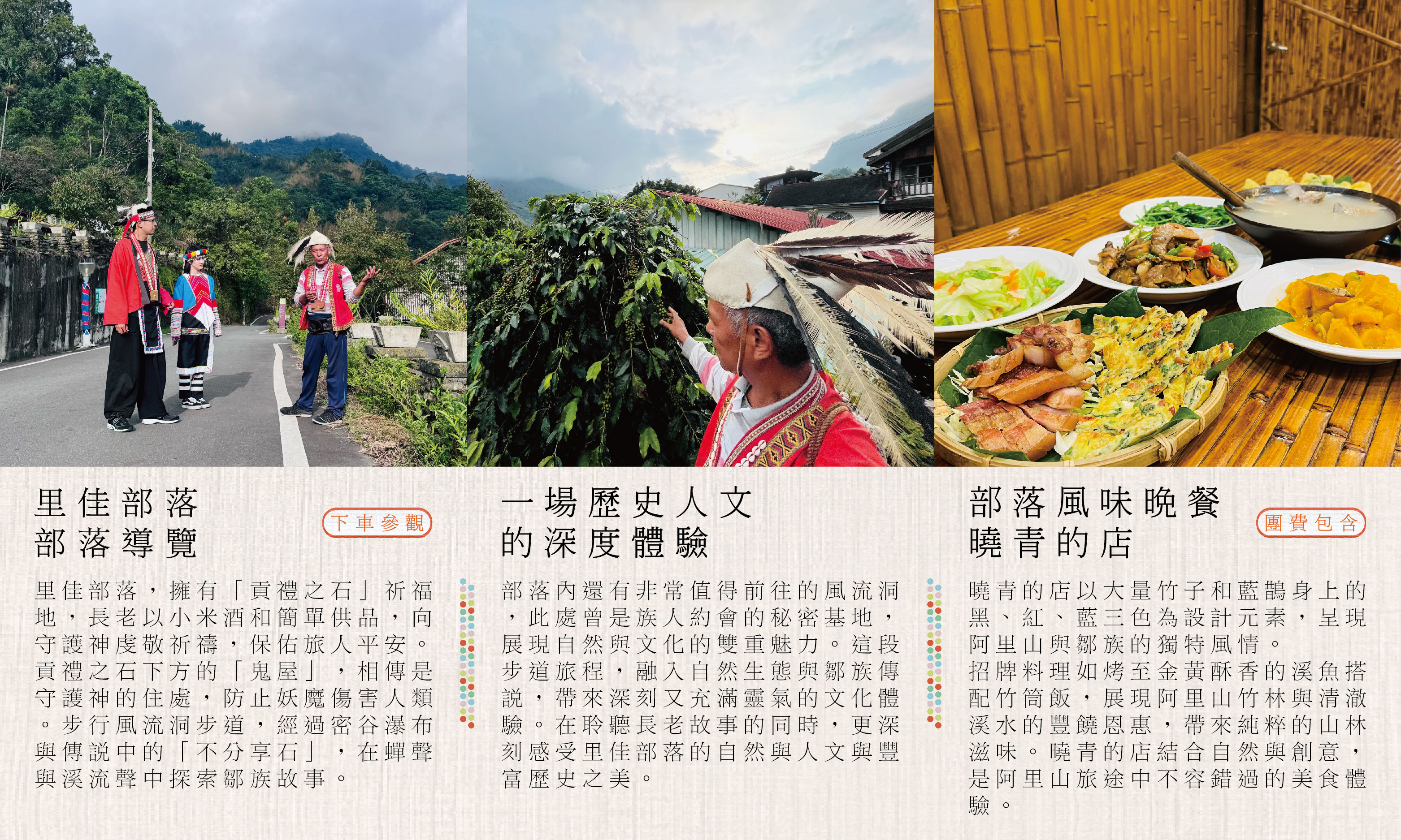 第一天 𝐹𝑖𝑟𝑠𝑡 𝐷𝑎𝑦啟程 ⟡ 到府接送 / 嘉義火車站 ⇀ 觸口遊客中心 ⇀ 隙頂觀景台 ⇀ ✩ 贈送當地名物「 小米甜甜圈 」 ♡ 奮起湖老街 ⇀ 一覽原民文化 ♡ 達邦部落〖 文化探索、歷史建築 〗⇀ 藍色部落深度遊 ♡ 里佳部落 ⇀ 夜宿 ⟡ 嘉娜民宿