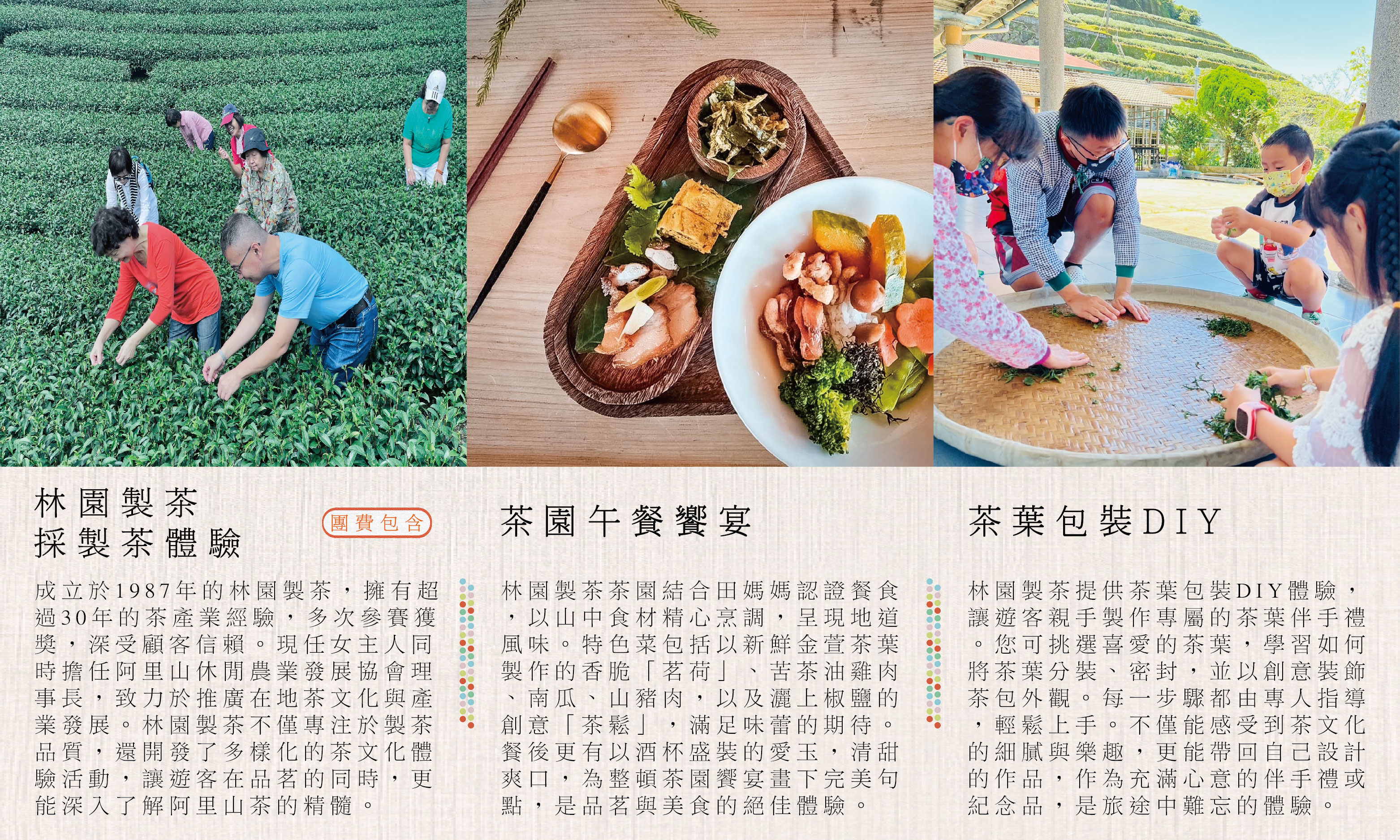 第二天 𝑆𝑒𝑐𝑜𝑛𝑑 𝐷𝑎𝑦啟程 ⟡ 嘉娜民宿 ⇀ 一日茶農體驗 ♡ 林園製茶廠〖 製茶體驗、伴手禮 DIY 〗⇀ ✩ 台灣此生必遊阿里山 ♡ 阿里山森林遊樂區〖 專業導覽、巨木群落、山林火車體驗 〗⇀ 復歸 ⟡ 溫暖的家 / 嘉義火車站