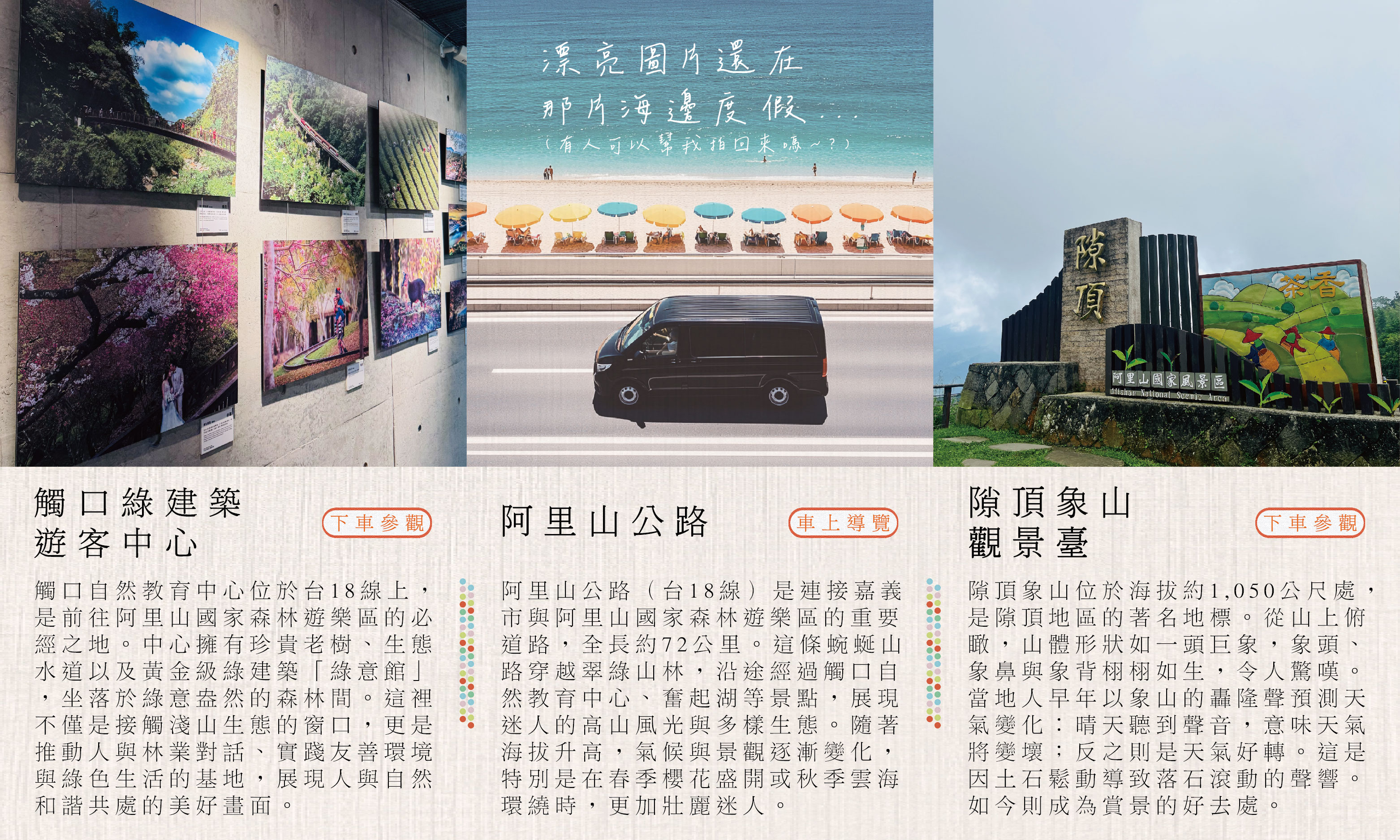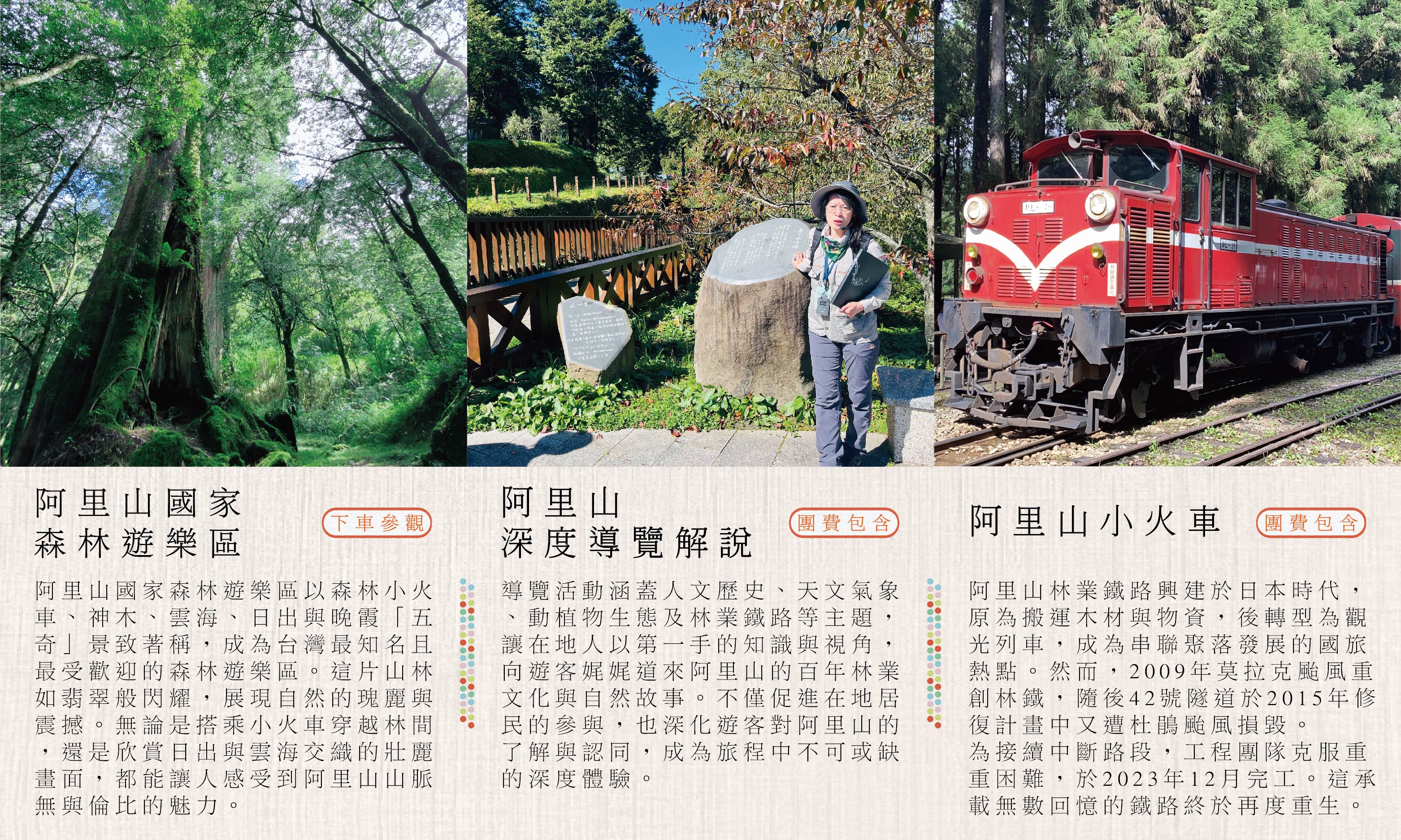 在嘉義縣的阿里山森林遊樂區探索巨木群落,漫步隙頂觀景台欣賞雲海美景,品味奮起湖老街的在地名物與林園製茶廠的茶農體驗,沉浸於達邦、里佳部落的深度文化.全程由賓士專車到府接送,讓您品味阿里山的製茶森林旅行的美好 .ᐟ.ᐟ.ᐟ( 若遇未開團日期請洽業務,另有散拚團,6人成行 )