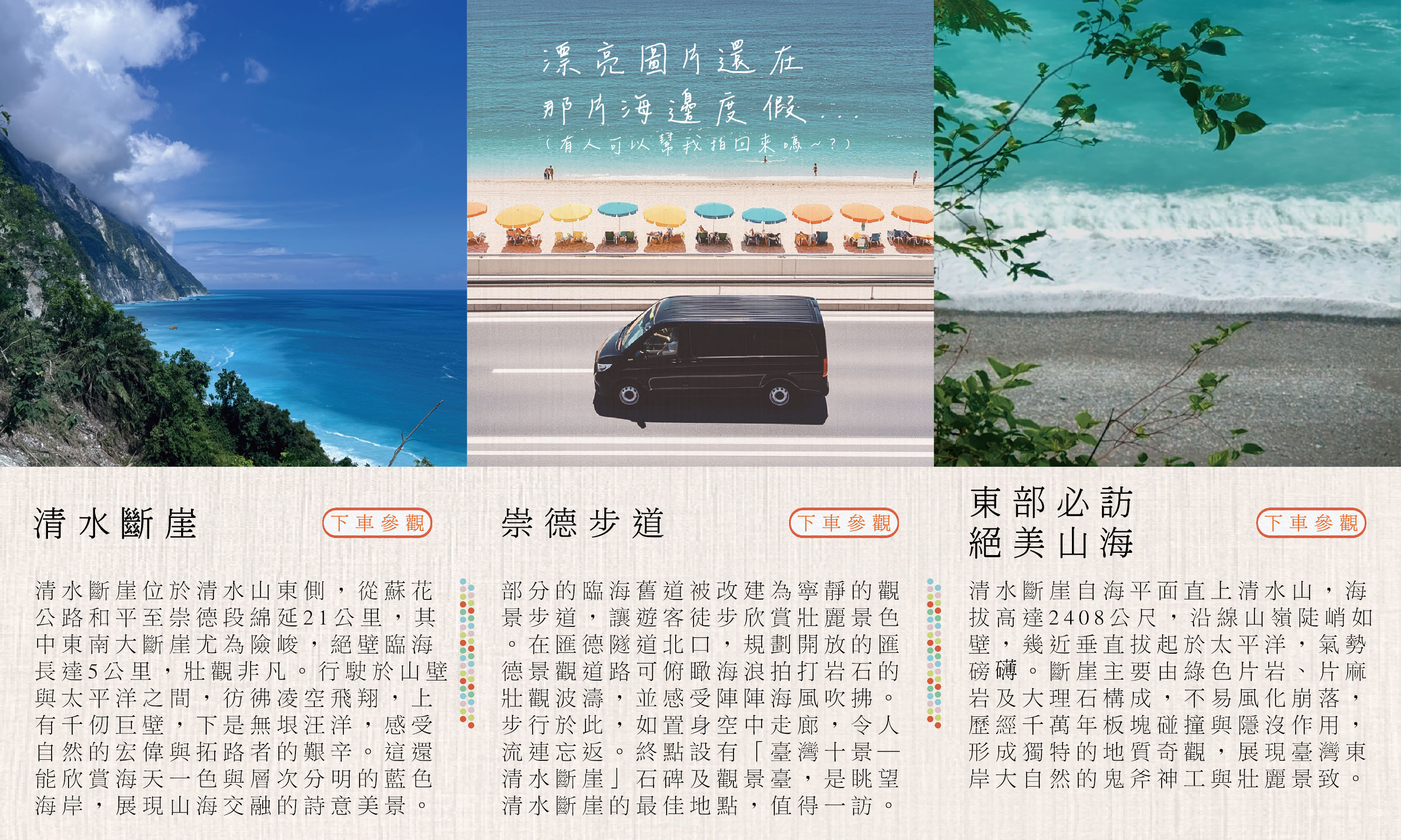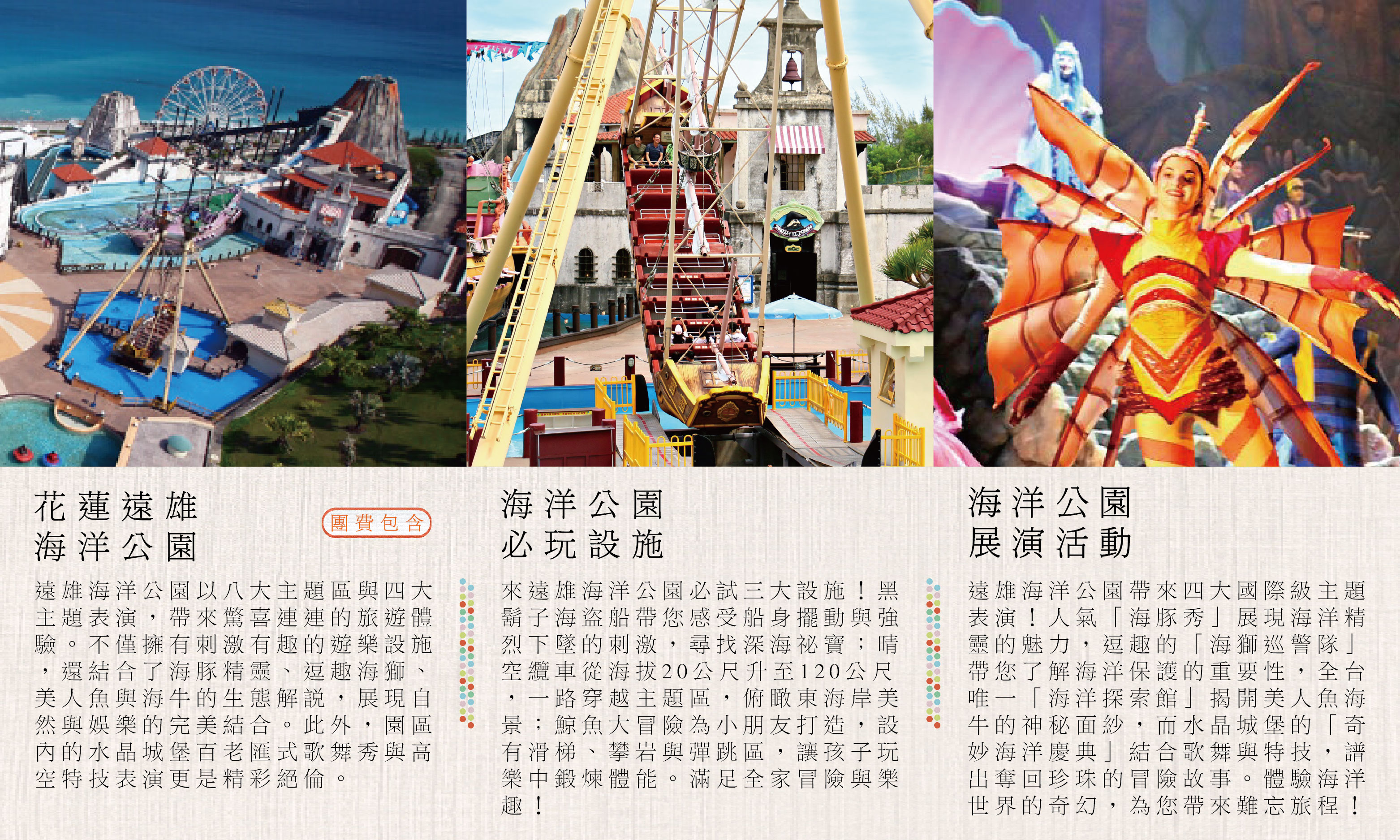 前往花蓮海洋公園,探索豐富的海洋生態,享受精彩的遊樂設施。最後登上清水斷崖觀景台,欣賞全台最壯麗的海岸線,為這趟豐富的旅程畫下完美句點。