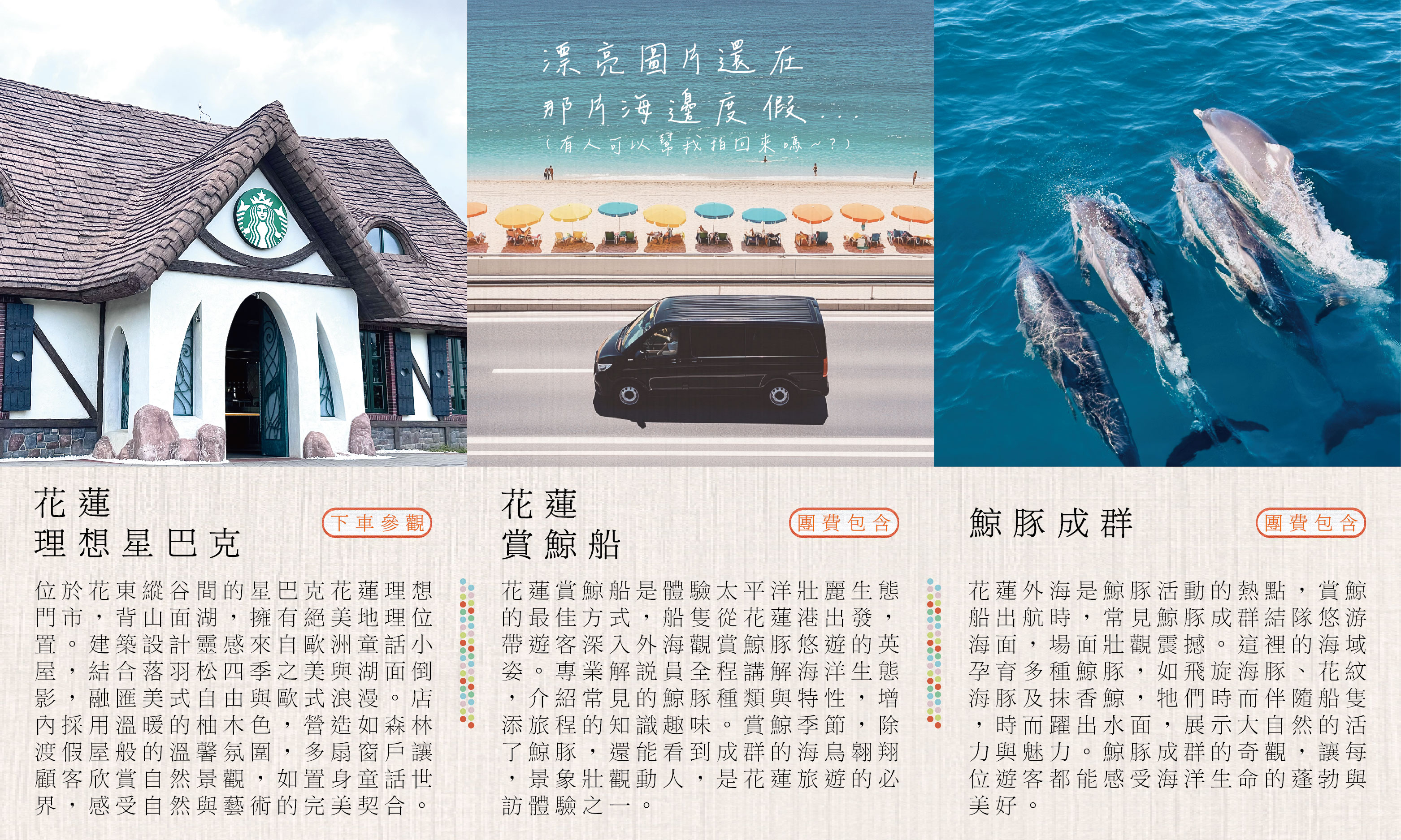 早晨悠遊台開心農場,漫步向日廣場,登上四八高地眺望花蓮平原。造訪奇萊鼻燈塔與七星潭,感受東海岸清新氣息。下午特別安排賞鯨之旅,與海洋生物近距離接觸,體驗難忘的海上冒險。