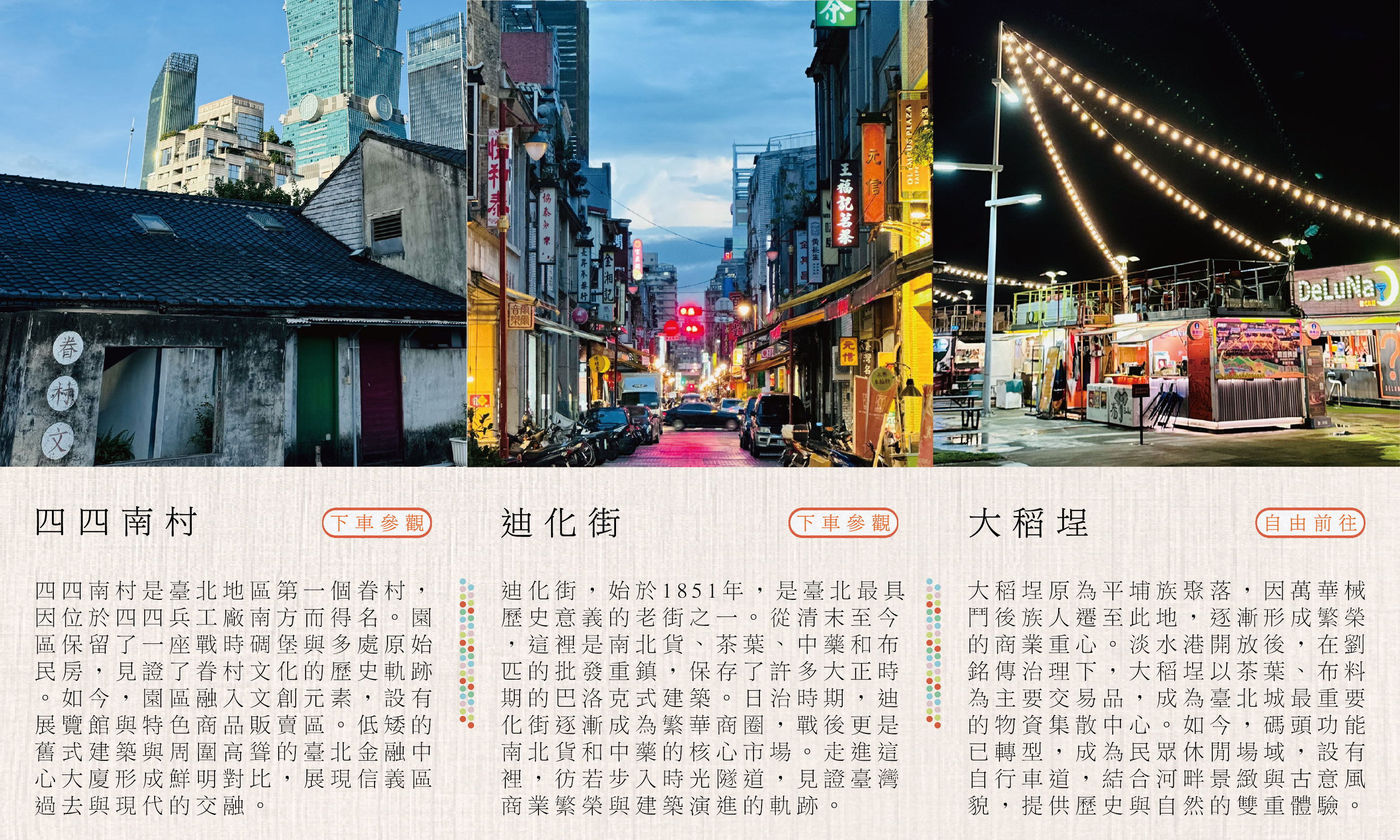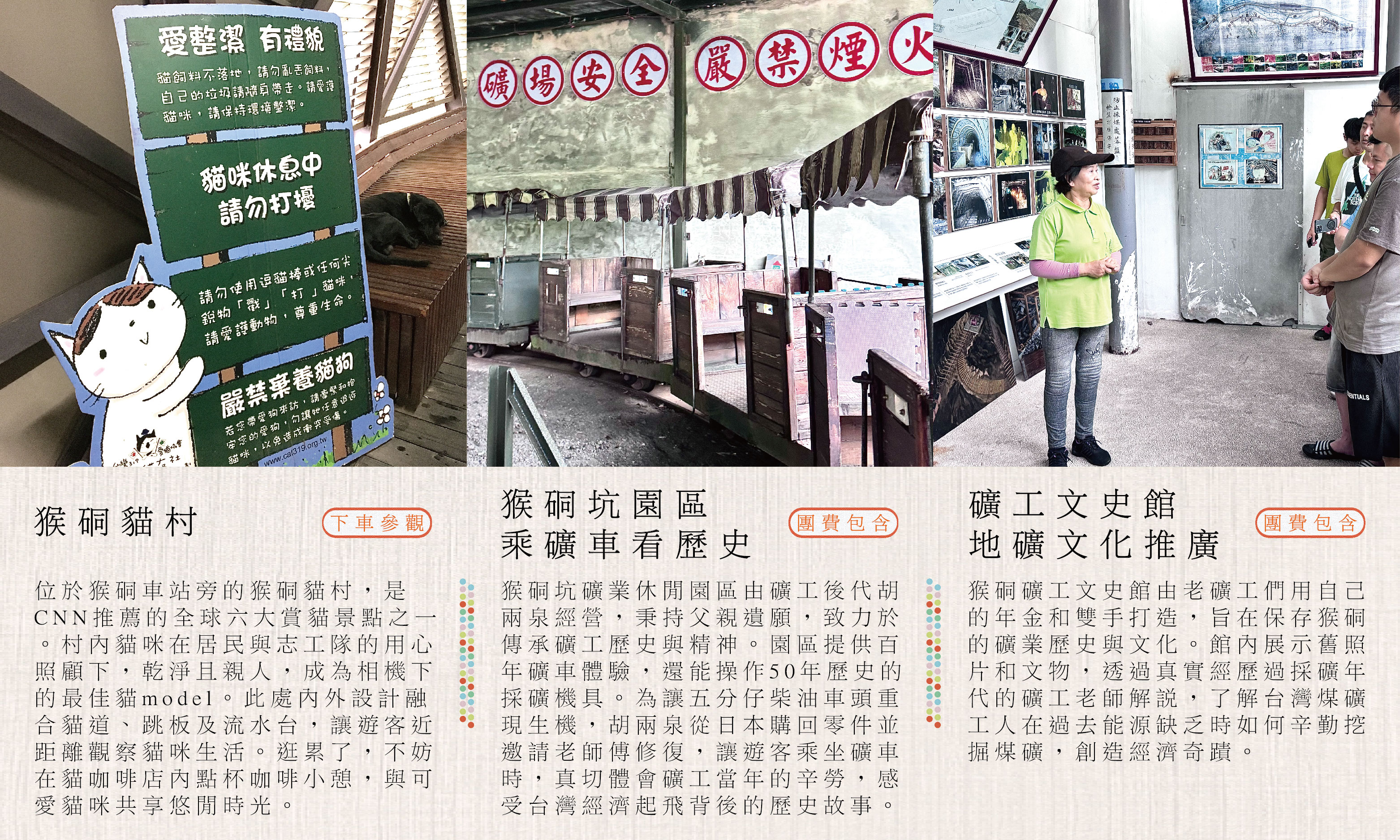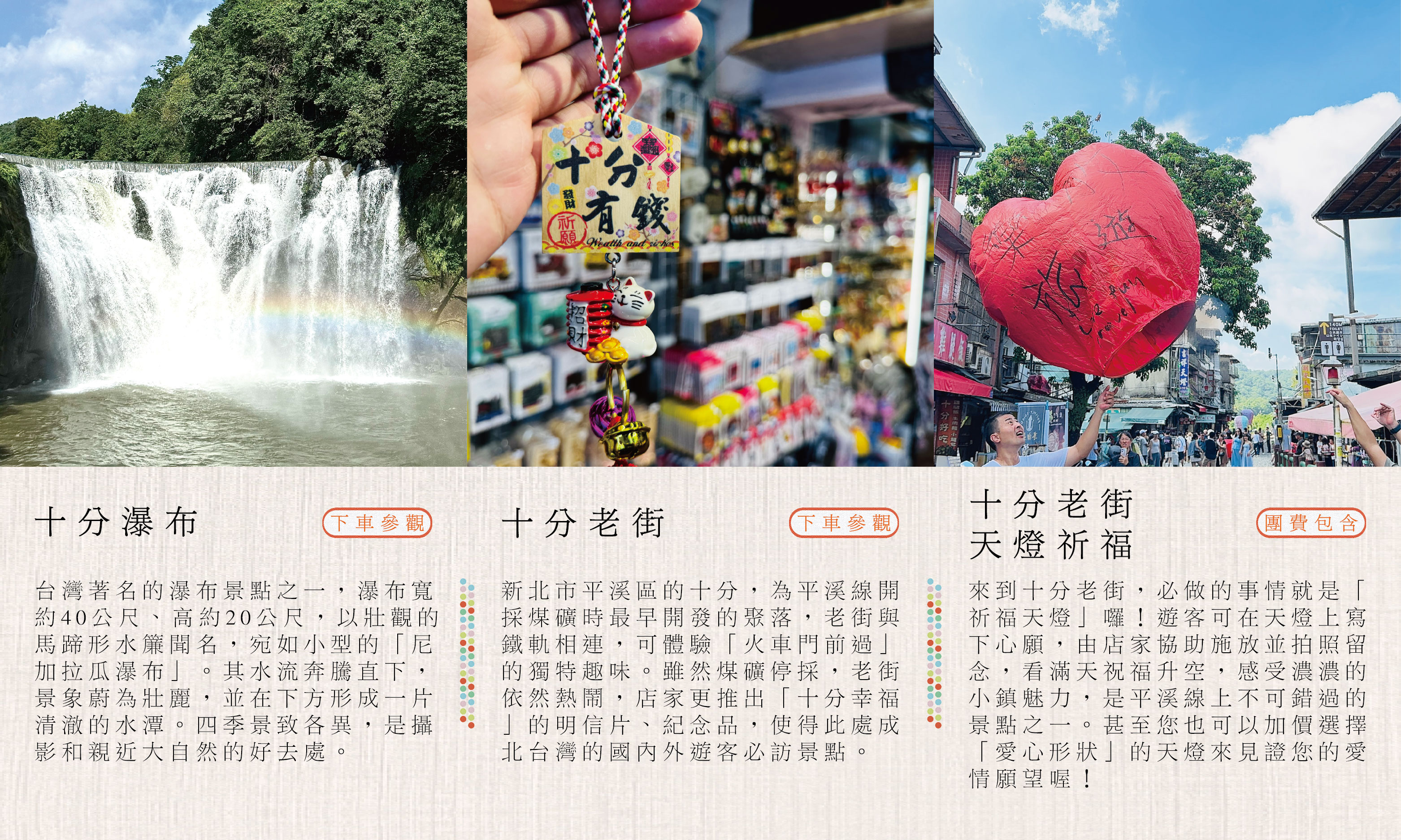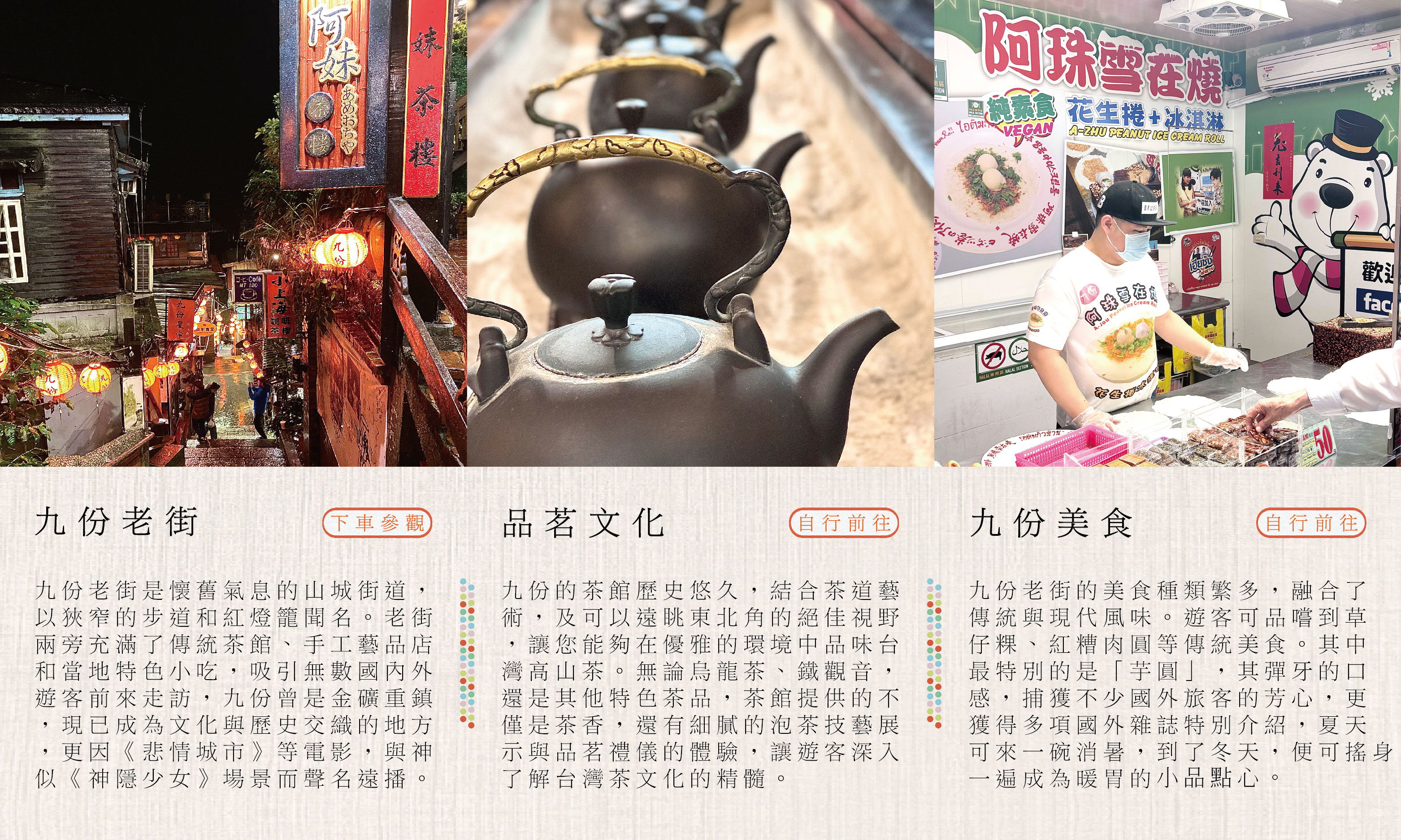 踏上一趟充滿驚喜與回憶的山城之旅! 首站來到十分老街,在全台最靠近天空的鐵道老街,放飛專屬於您的天燈,許下美好願望。獨家提供四色天燈,為旅程寫下最浪漫的開場。中午走訪全台最療癒的貓咪天堂-猴硐貓村,在懷舊的礦業老街上,與可愛貓咪共進午餐,品嚐道地的礦工麵或豬油拌飯,感受最在地的礦村風味。下午特別安排礦工隧道深度體驗,由專業導覽員帶您穿越時空,探索昔日礦工的工作環境。在猴硐礦工文史館,細細品味這座曾經「黑金」盛產地的繁華過往。入夜後入住九份山城,在海天一線的夜景中,為第一天的深度文化之旅,畫下完美句點。 第二天從九份出發,探索北台灣最迷人的礦業秘境!首站來到見證台灣採金歷史的黃金博物館,親手體驗淘金樂趣,走入昔日繁華的金瓜石礦業生活。特別安排參觀充滿傳奇色彩的黃金瀑布,欣賞大自然與礦業遺跡交織的獨特景觀。在金剛山制高點,一覽壯觀的陰陽海景致,聆聽這片土地的動人故事。下午轉往台北市區,漫步在保存完好的四四南村,感受眷村的溫度與人情味。最後造訪百年老街迪化街,在古樸的紅磚老屋中,品味最道地的台北味。 #深度旅遊 #台灣之美 #黃金博物館 #十分老街 #猴硐貓村 #九份山城 #陰陽海 #四四南村 #迪化街 #礦業文化 #文化之旅 #二日遊