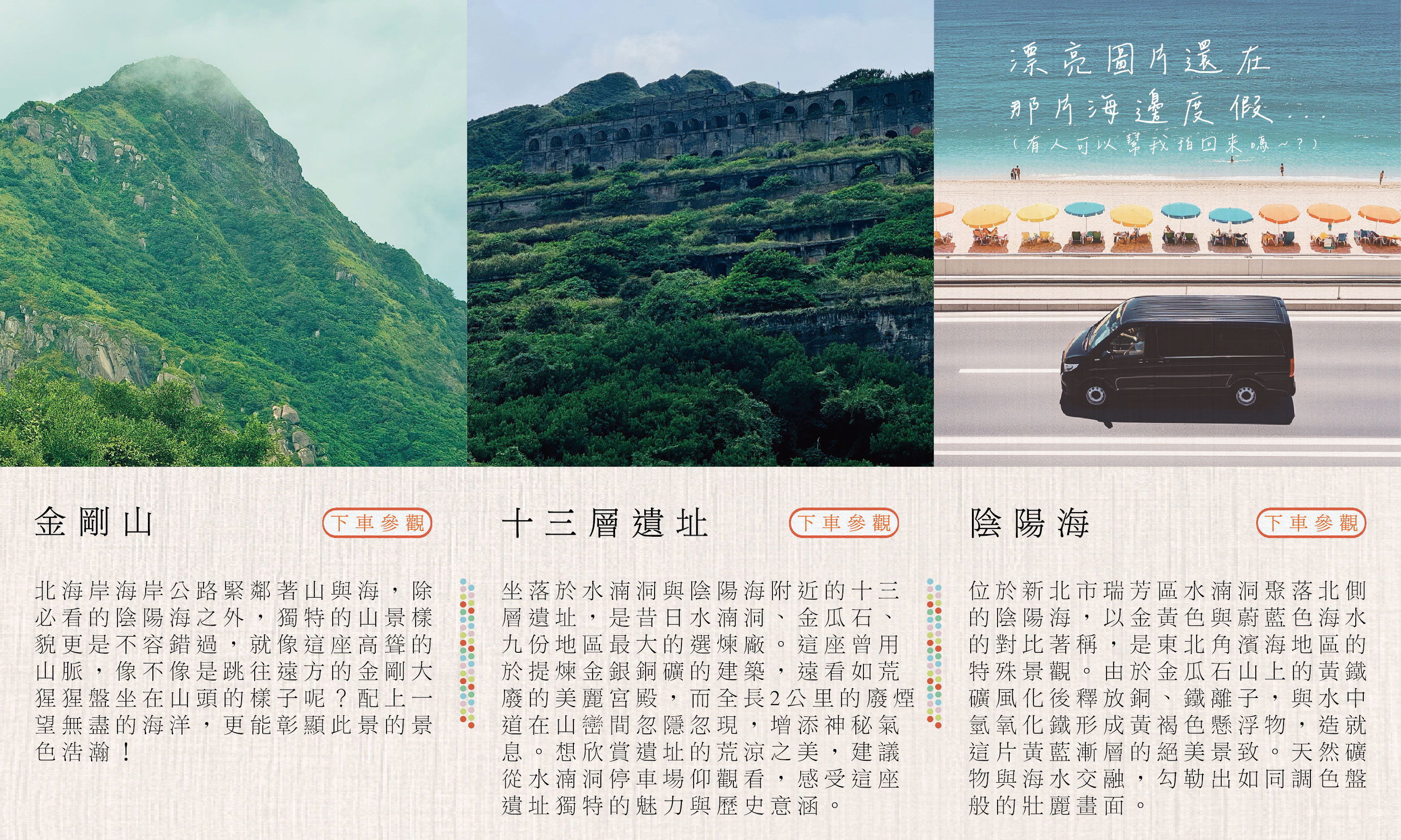 第二天 𝑆𝑒𝑐𝑜𝑛𝑑 𝐷𝑎𝑦啟程 ⟡ 山海夜景 ⇀ 黃金歲月 ♡ 黃金博物館〖淘金體驗〗⇀ 礦山秘境 ♡ 黃金瀑布 ⇀ ✩ 絕美海景 ♡ 金剛山陰陽海 ⇀ 時光記憶 ♡ 四四南村〖眷村風情、文創市集〗⇀ 老城記趣 ♡ 迪化街〖百年老舖、台式風情〗⇀ 復歸 ⟡ 溫暖的家