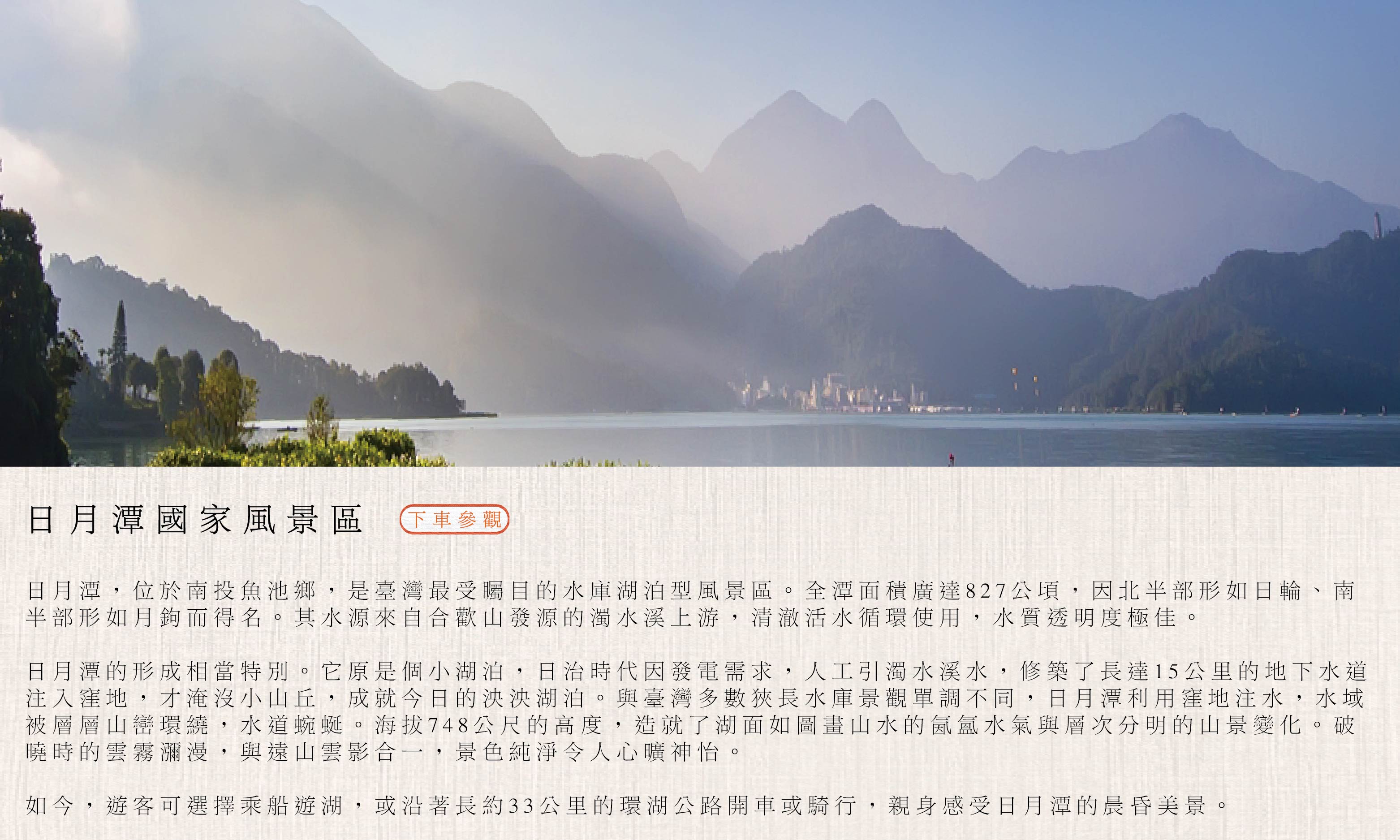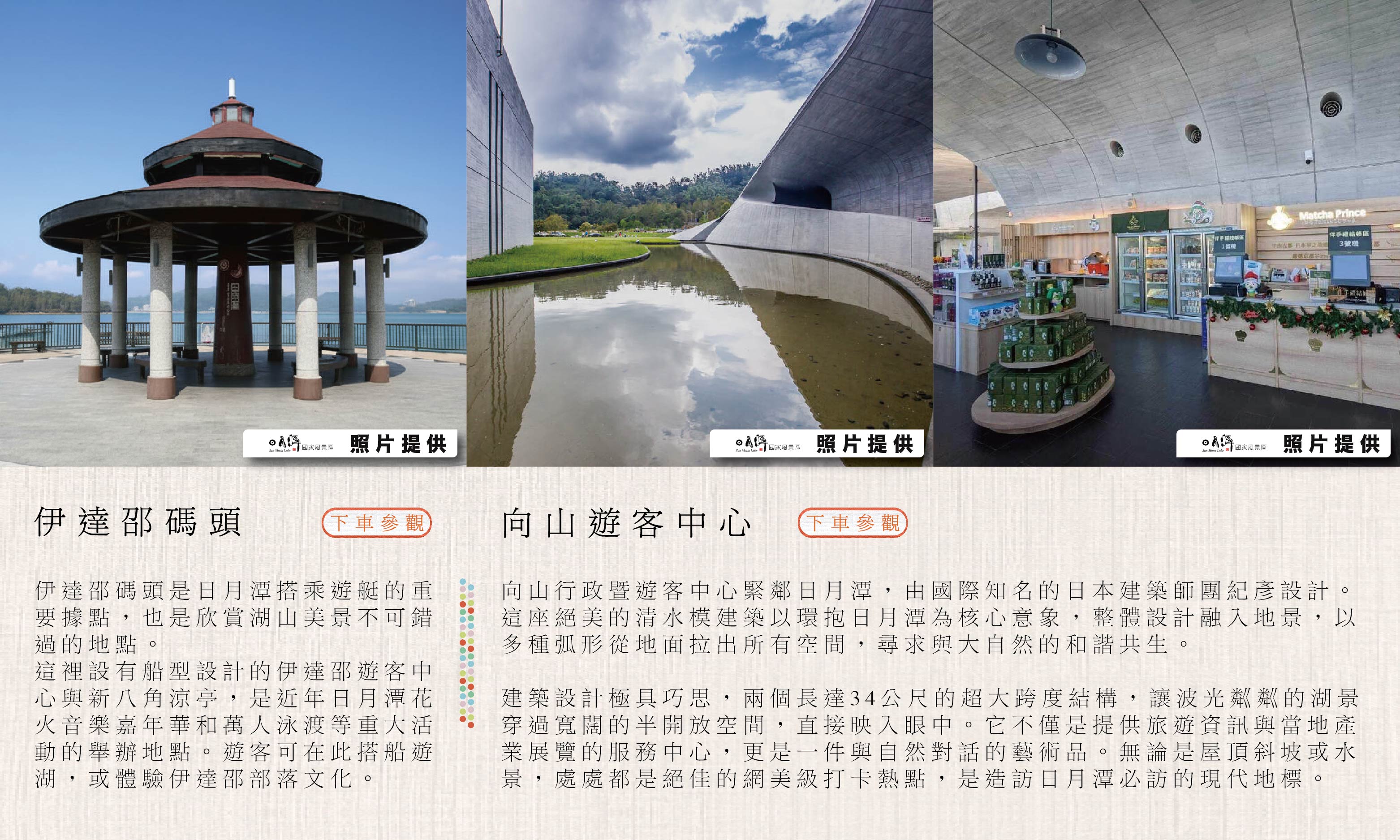 第一天 𝐹𝑖𝑟𝑠𝑡 𝐷𝑎𝑦啟程 ⟡ 台中高鐵車站 ⇀ 湖畔悠遊 ♡ 日月潭伊達邵碼頭 ⇀ 日月巡禮 ♡ 日月潭遊船〖三大碼頭巡航・飽覽玄光寺水社湖光〗⇀ 伊達邵商圈〖原民特色小吃〗⇀ 建築之美 ♡ 向山遊客中心〖清水模設計・眺望絕美湖景〗⇀ 東埔溫泉 ⟡〖享用美人湯療癒時光〗⇀ 晚餐饗宴 ♡ 在地風味料理〖梅子料理・溫暖野菜火鍋〗⇀ 夜宿 ⟡ 溫泉鄉