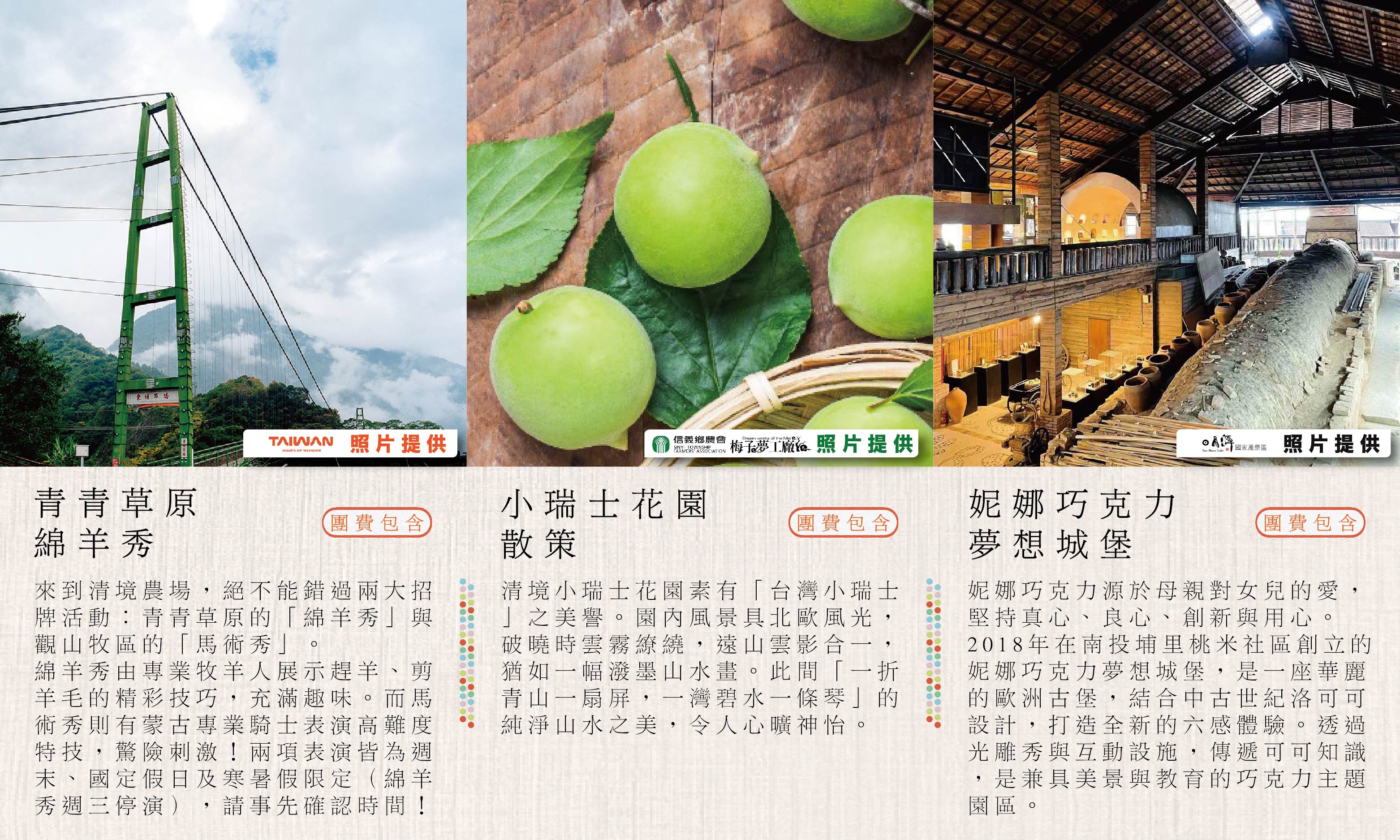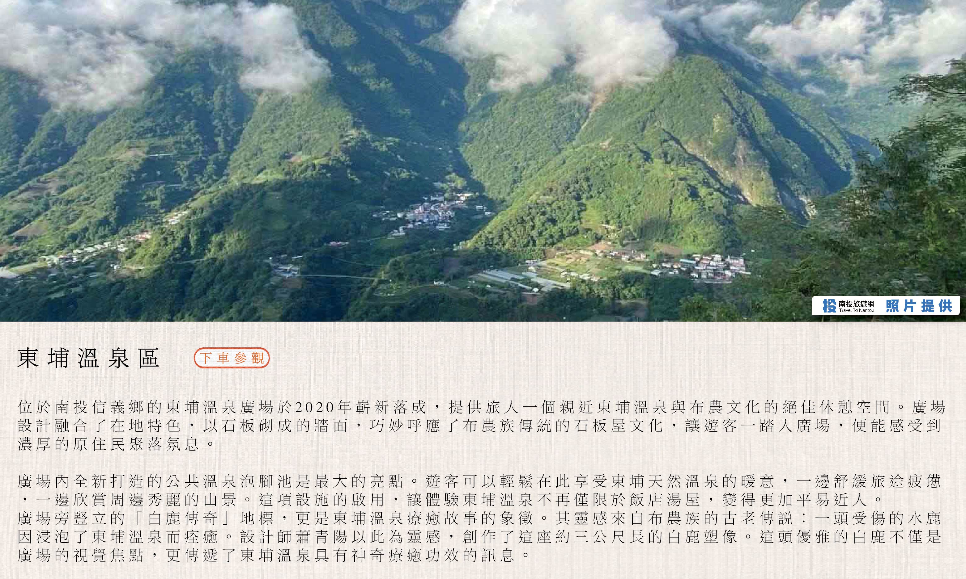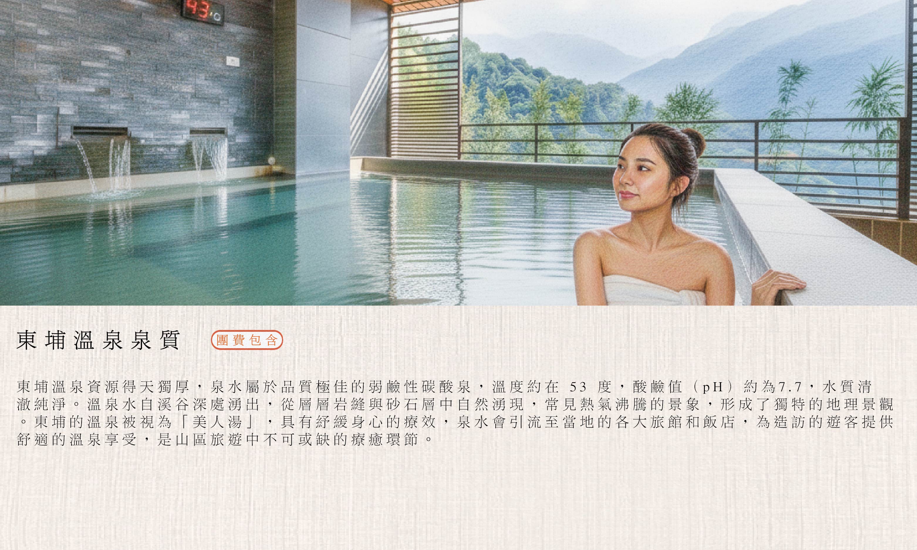 在南投縣展開一場身心療癒的溫泉山水之旅。首日,搭乘日月潭遊船暢遊三大碼頭,從伊達邵碼頭、水社碼頭到玄光寺,盡覽湖光山色,並在向山遊客中心感受建築之美與湖畔靜謐。接著前往擁有美人湯之稱的東埔溫泉區,入住東埔帝綸溫泉飯店享受舒緩泡湯。次日,在山林間走過東埔吊橋,健行挑戰彩虹吊橋步道,探訪飛瀑直下的彩虹瀑布。午後來到信義鄉,參觀信義梅子夢工廠,品嚐在地梅製品,最後在水里蛇窯感受台灣古窯的文化氣息,為旅程畫下完美句點。全程賓士專車接送,輕鬆玩遍南投山水與溫泉秘境 .ᐟ.ᐟ.ᐟ(若遇未開團日期請洽業務,另有散拚團,