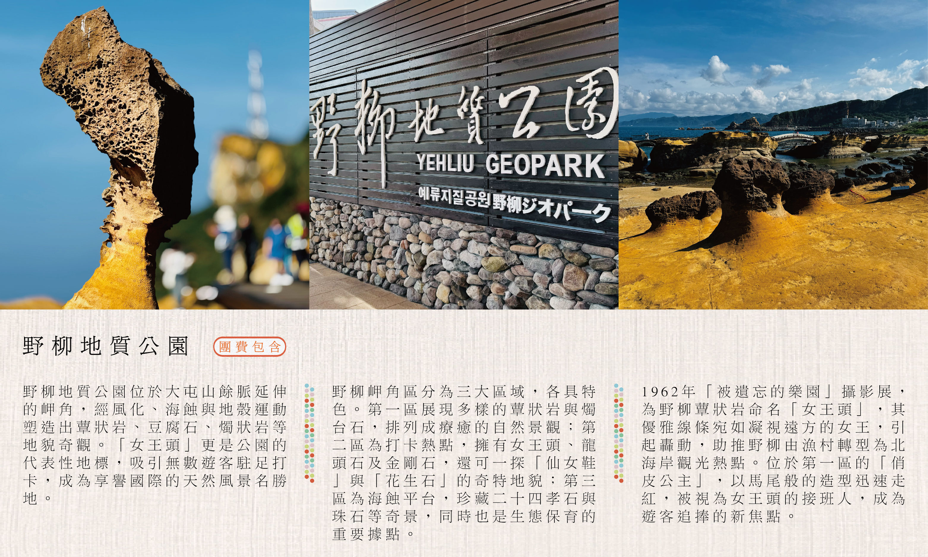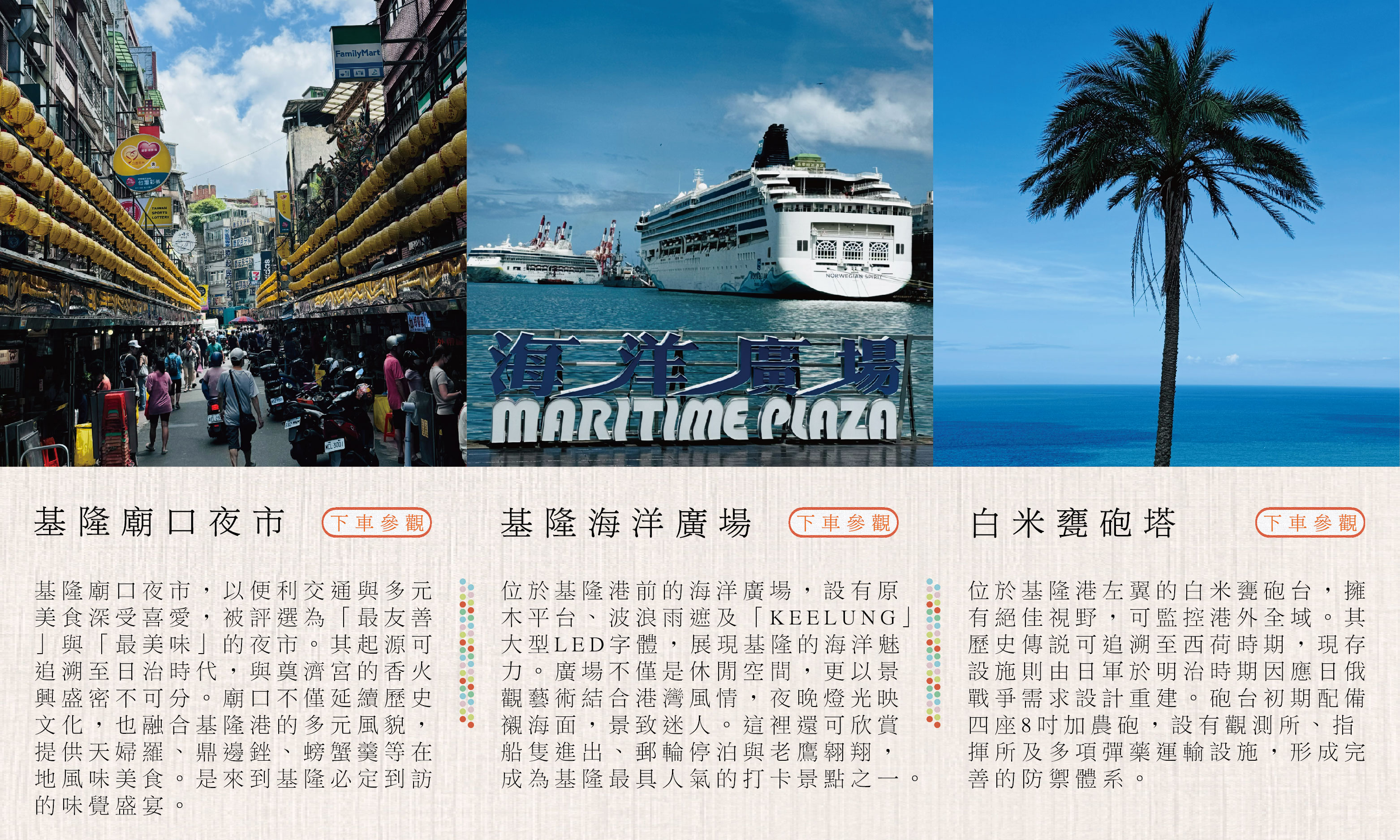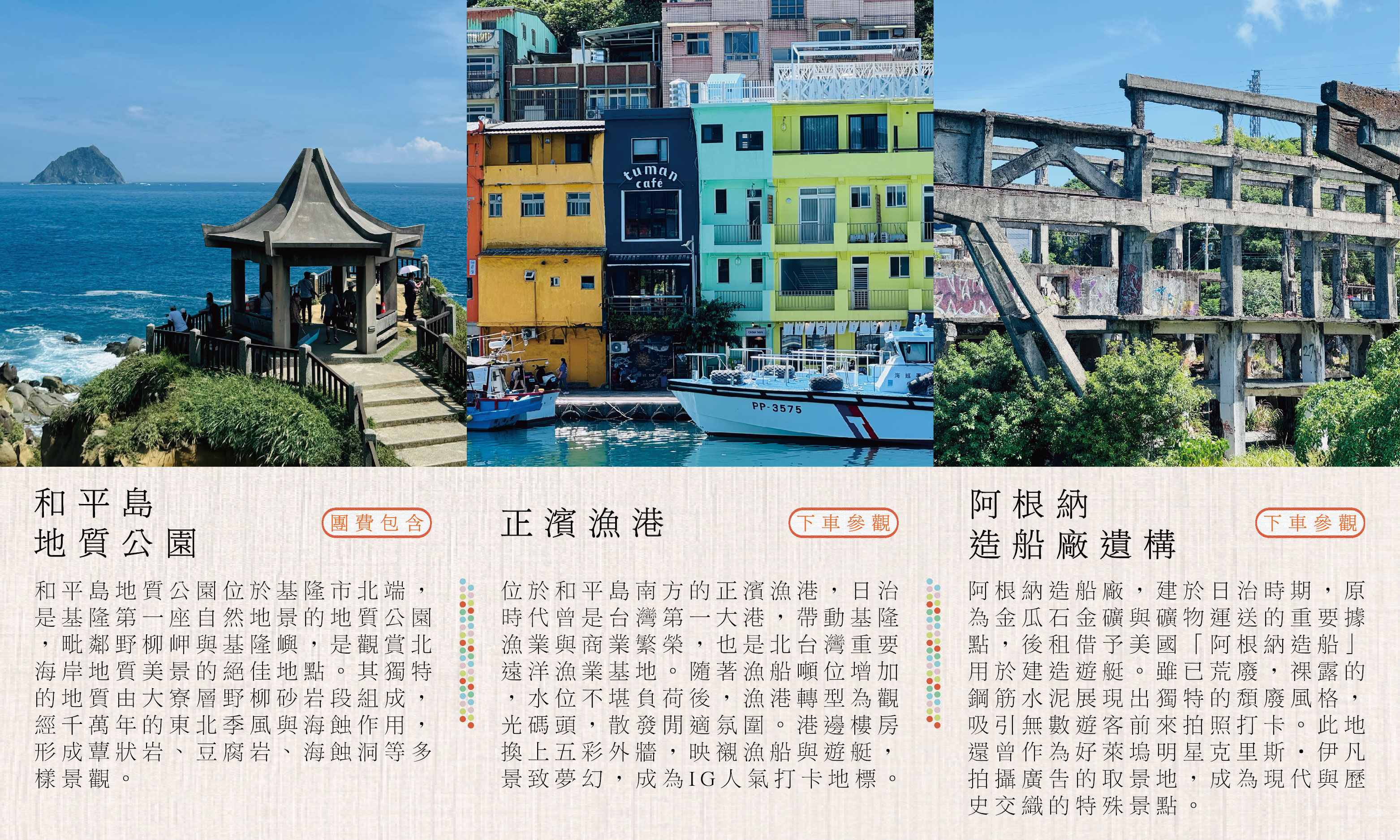 在基隆市的正濱漁港欣賞彩色屋的台版威尼斯景致,到基隆海洋廣場看大船入港,品味廟口小吃的在地美食,探索白米甕砲台的歷史遺跡與野柳地質公園的女王頭風華.全程由賓士專車到府接送,讓您品味北海岸的海港風情旅行的美好 .ᐟ.ᐟ.ᐟ( 若遇未開團日期請洽業務,另有散拚團,6人成行 )