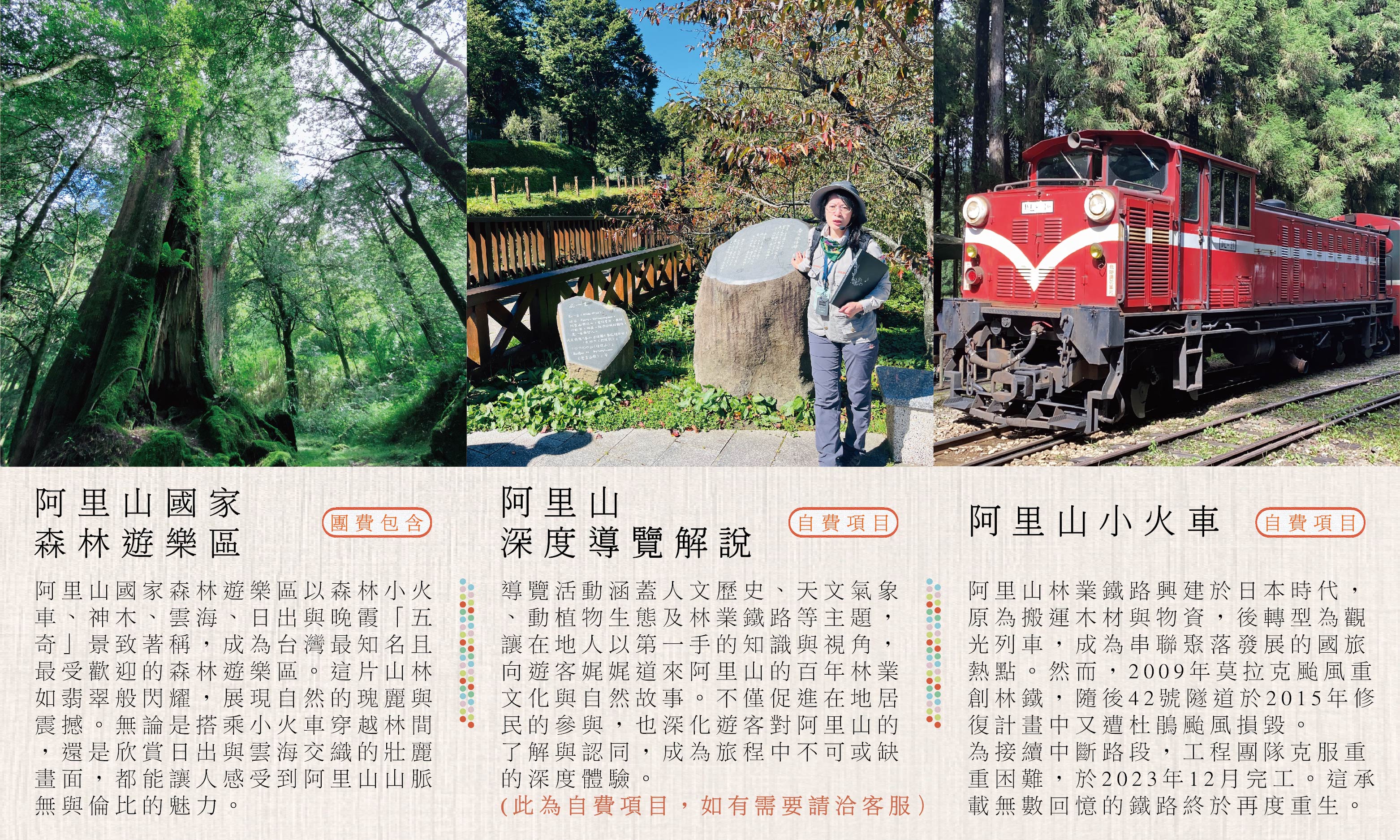 在嘉義阿里山展開一場雲端上的奢華旅程。首站漫步二延平步道,欣賞茶園與雲海交織的絕美景致,於佐一茶屋品嚐精緻日式佳餚。深入優遊吧斯體驗鄒族文化與歌舞,漫遊奮起湖老街感受懷舊山城氛圍,夜宿全新地標——阿里山英迪格酒店,享受頂級休憩時光。次日深入阿里山森林遊樂區呼吸千年神木芬多精,造訪二萬平觀景台捕捉鐵道與雲霧的浪漫瞬間。全程賓士專車接送,尊享舒適與尊榮的避暑之旅 .ᐟ.ᐟ.ᐟ(若遇未開團日期請洽業務,另有散拚團,6人成行)