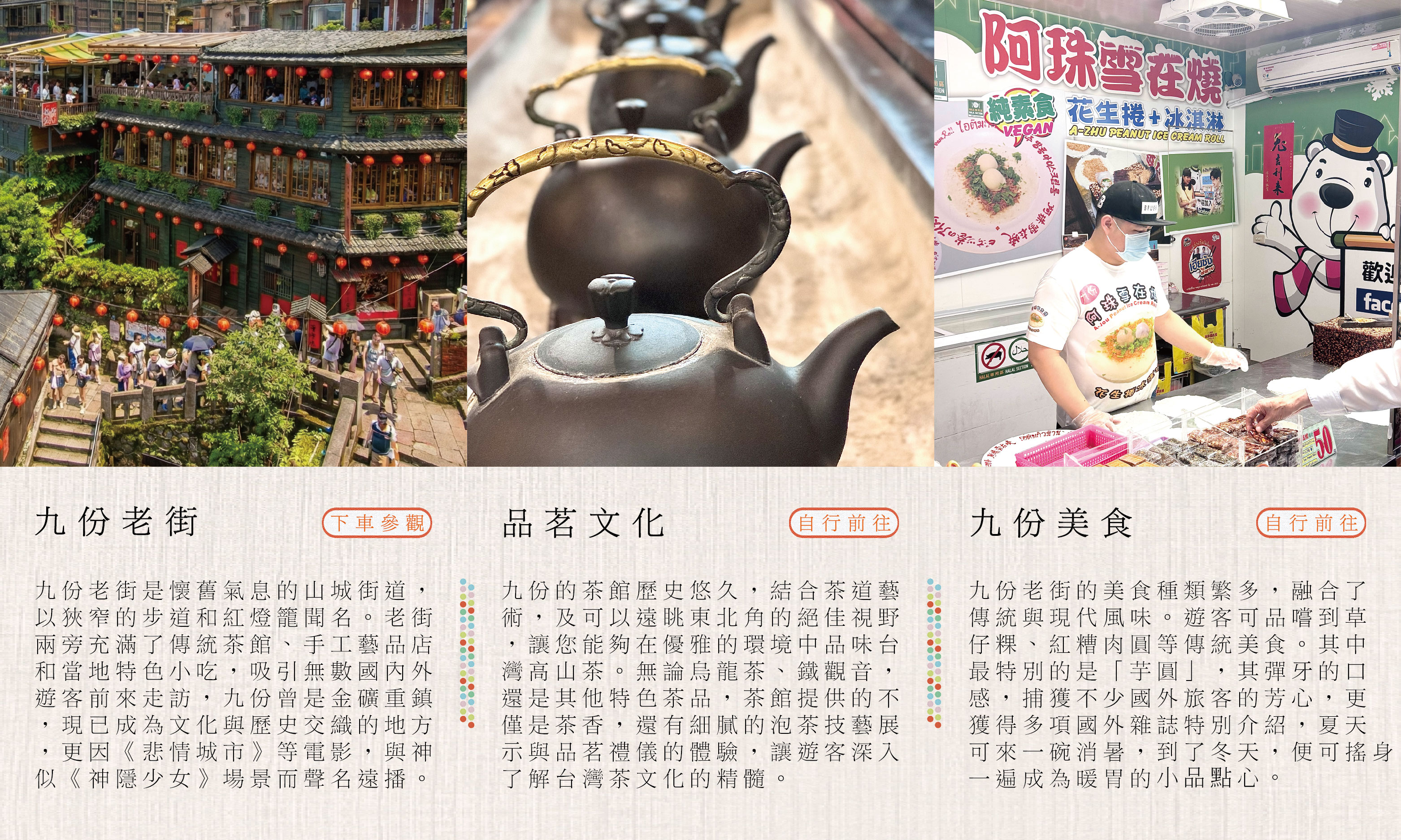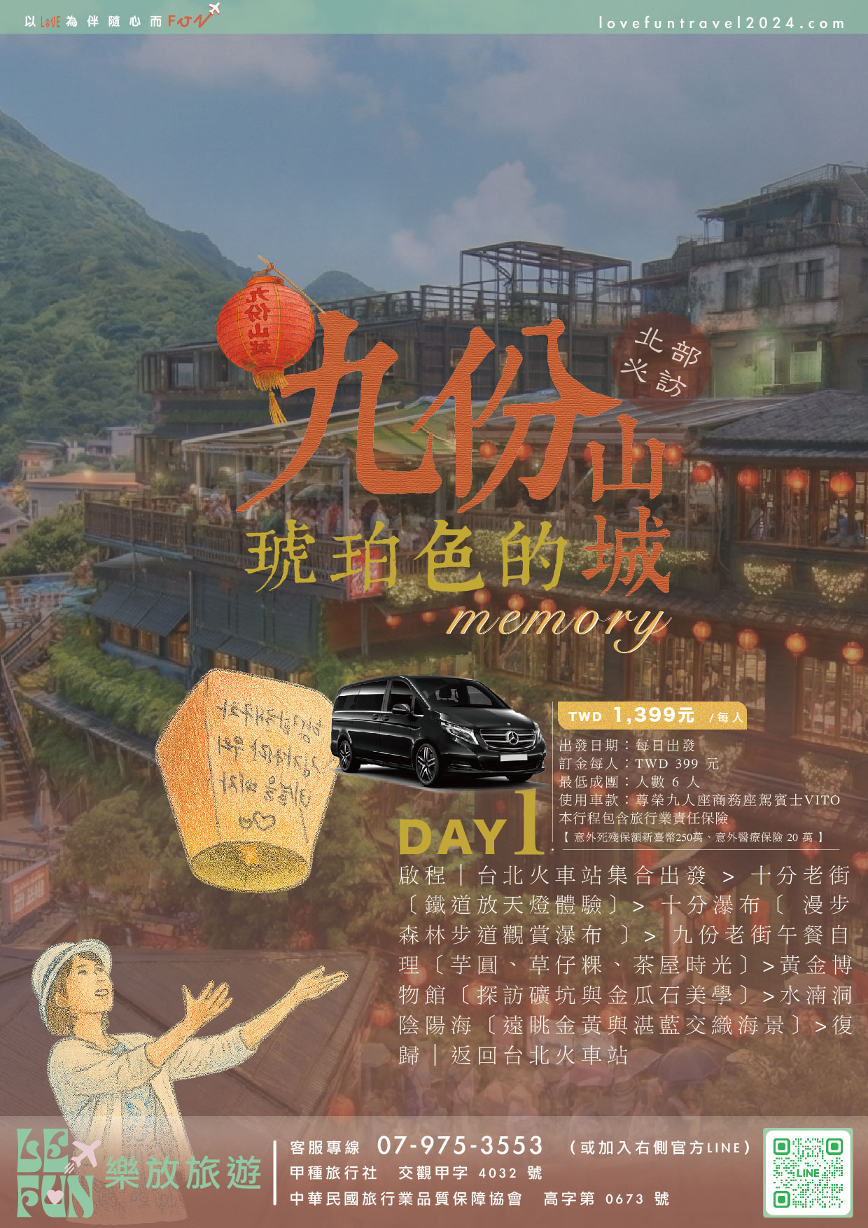 從台北車站優雅啟程,首站迎接瑞芳最具張力的「陰陽海」調色盤,感受大自然的鬼斧神工。隨後步入「黃金博物館」觸摸百年金礦的歷史餘溫,並在「九份老街」的紅燈籠與茶香中,尋找如電影般的慢活時光。午後轉往平溪線,與全台最寬的「十分瀑布」相遇,感受水氣帶來的負離子洗禮。最後在「十分老街」的鐵道旁,親手寫下心願,讓天燈帶著祝福冉冉升空。全程賓士包車到府接送,免去轉乘與找車位的煩惱,讓您與閨蜜專注於這場復古與浪漫交織的旅行 .ᐟ.ᐟ.ᐟ(若欲規劃多日遊或客製化行程請洽業務,另有散拼團,6人成行)