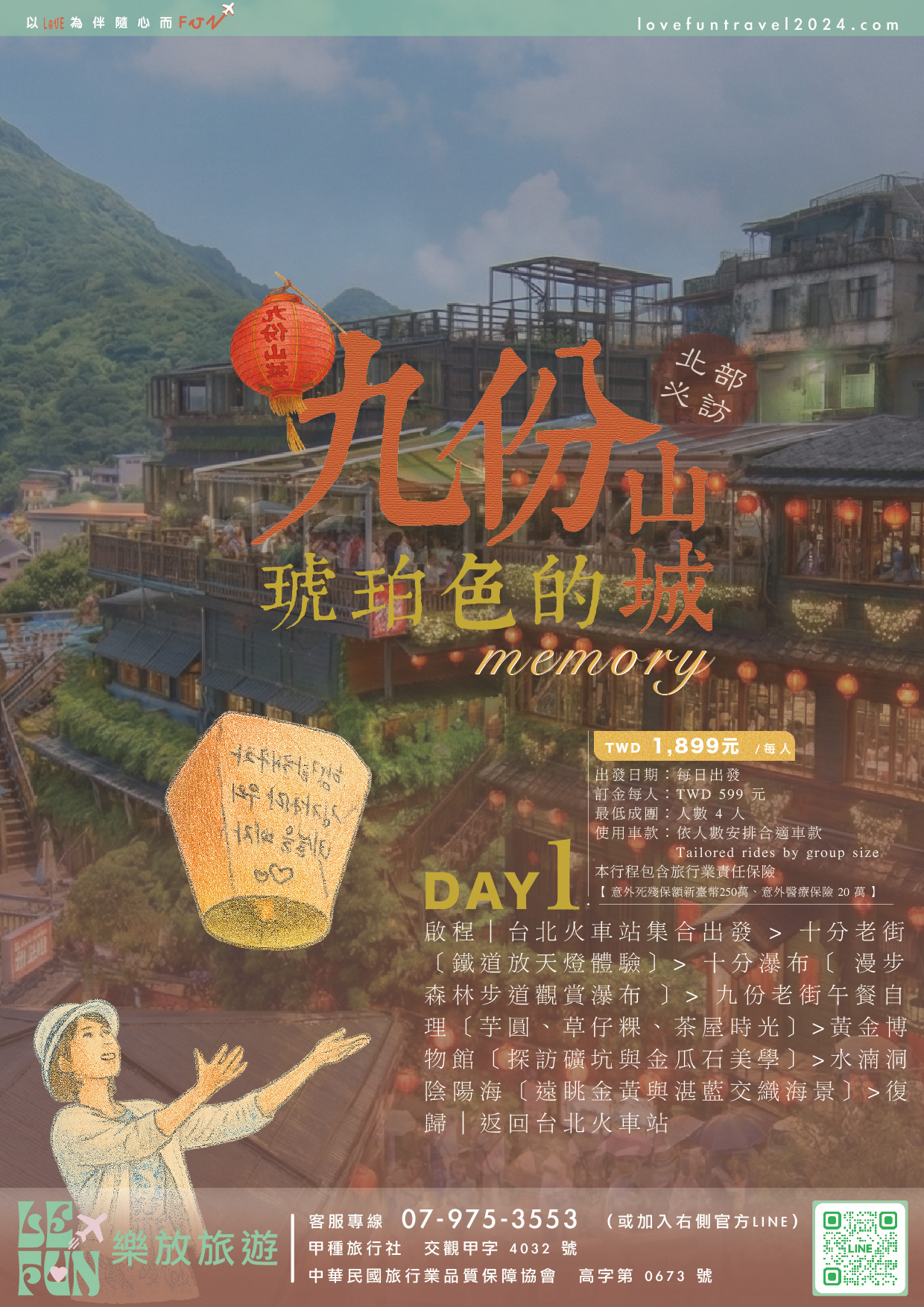 第一天 𝐹𝑖𝑟𝑠𝑡 𝐷𝑎𝑦啟程 ⟡ 台北火車站 ⇀ 鐵道願望 ♡ 十分老街〖祈福天燈・鐵道懷舊〗⇀ 台版尼加拉瀑布 ♡ 十分瀑布〖震撼負離子芬多精〗⇀ 霧色山城 ♡ 九份老街〖茶藝文化・懷舊散策〗⇀ 淘金歲月 ♡ 黃金博物館〖觸摸 220kg 純金磚〗⇀ 自然調色盤 ♡ 水湳洞陰陽海〖奇幻山海美景〗⇀ 復歸 ⟡ 台北火車站